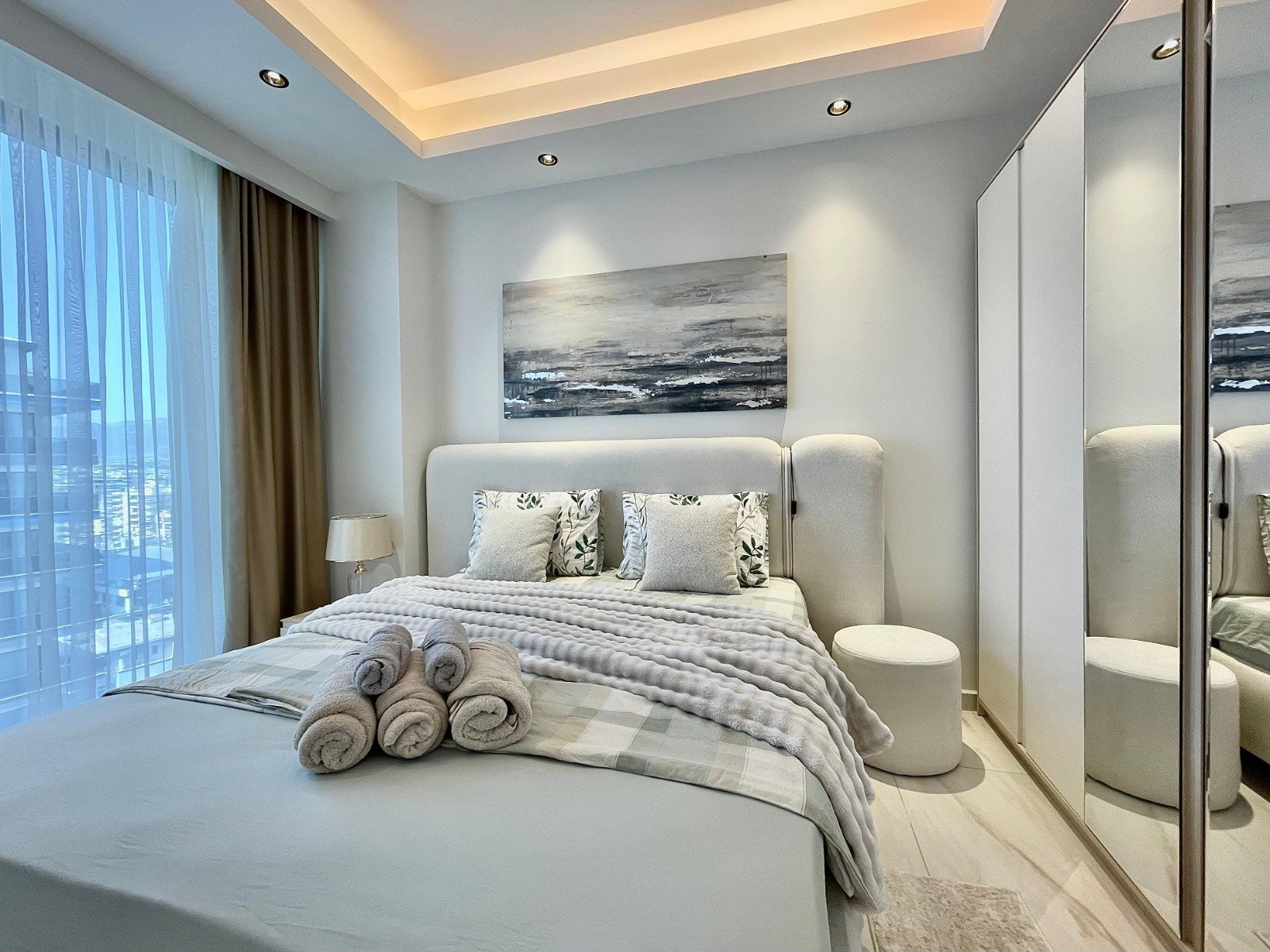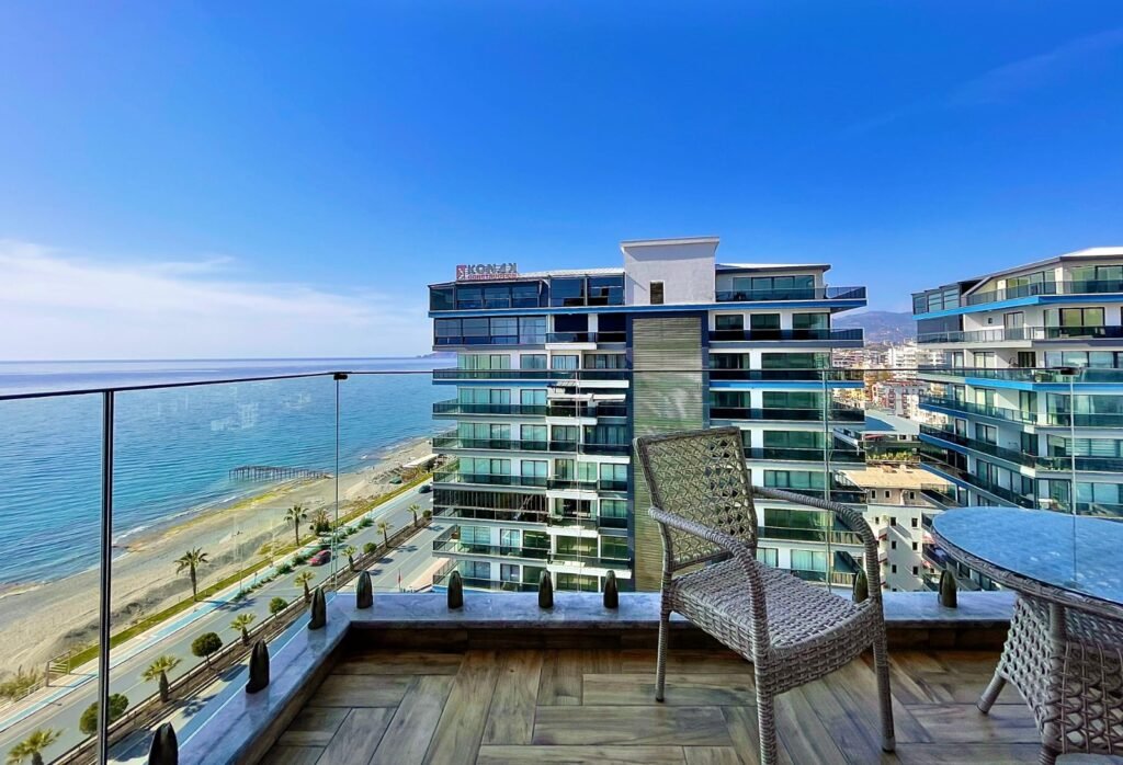 The apartment is located on the 11th floor and features a one-bedroom layout with a total area of 60 sq m. It features a spacious living room combined with a kitchen, a bedroom, a bathroom, and a balcony with breathtaking views of the Alanya coastline, the Mediterranean Sea, the fortress, and the Taurus Mountains. It is fully furnished and equipped with high-quality appliances, internet, and a smart TV. Cleaning, electricity, and water are not included in the rent.