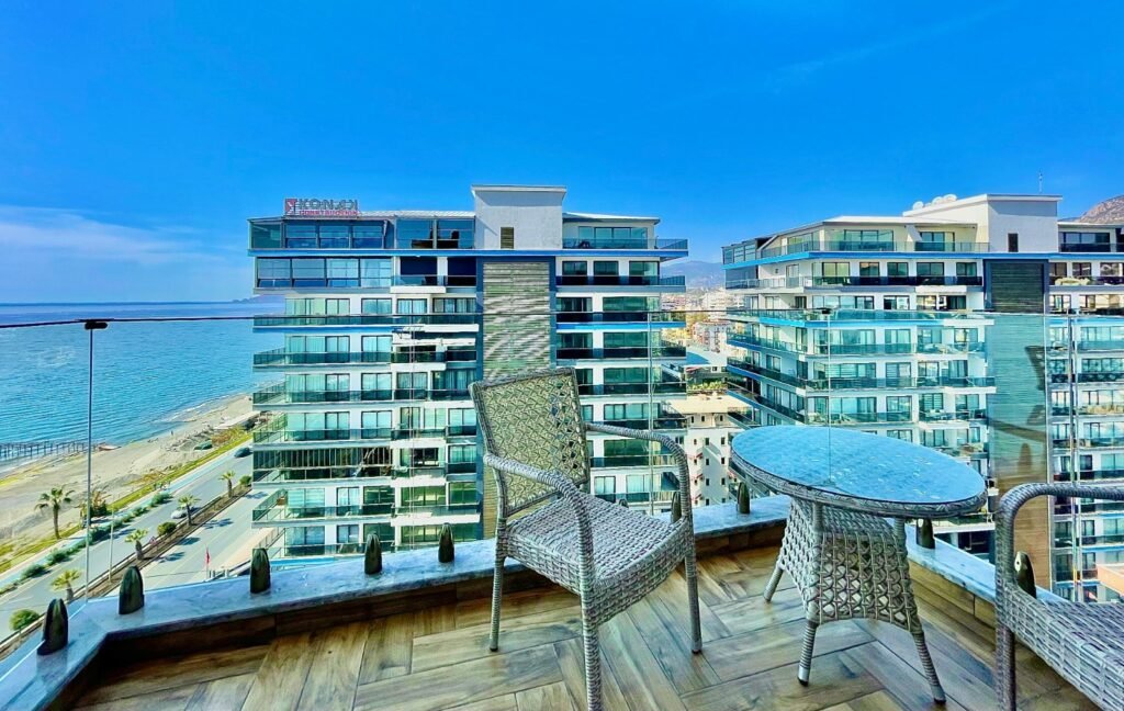The complex comprises three residential blocks with luxury amenities ideal for relaxation and leisure. It features a beautiful garden with green lawns, flower beds, and ornamental trees. There's underground parking for 100 cars and access to a private beach, as well as golf carts for transportation around the complex. The complex boasts a unique heated outdoor pool—the only one in Alanya—and a water park with six slides and a squash area.