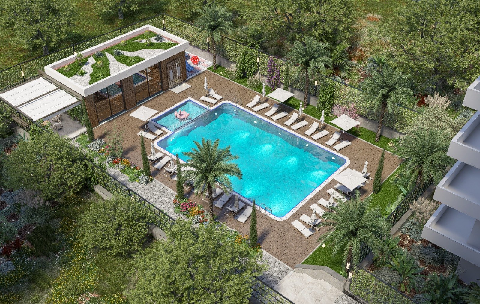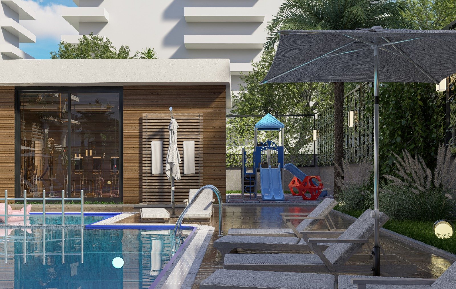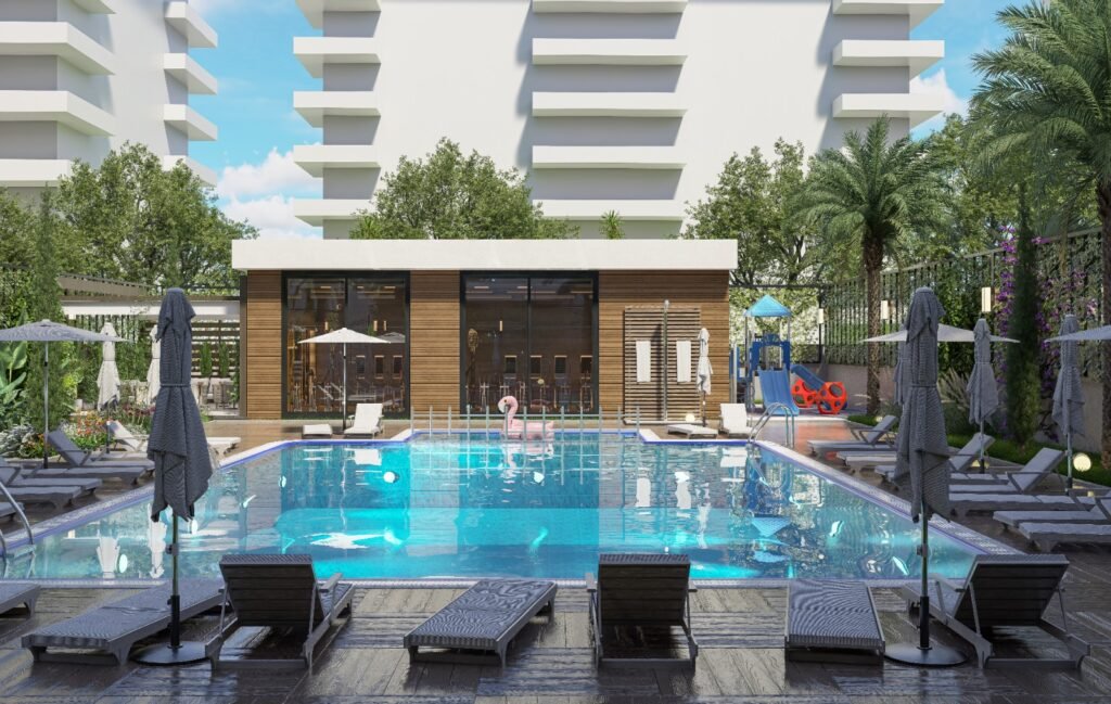 Комплекс создан по принципу комфортной жизни без компромиссов. Здесь предусмотрены открытый бассейн, фитнес-зал, сауна и детская площадка, что позволяет поддерживать баланс между отдыхом и активностью. Для удобства жителей оборудован крытый паркинг с зарядкой для электромобилей, а также дополнительная открытая парковка. Система солнечных панелей снижает расходы на электроэнергию в зонах общего пользования, а генератор гарантирует бесперебойную работу всех систем. Безопасность и комфорт дополняются современными лифтами и продуманной инфраструктурой.