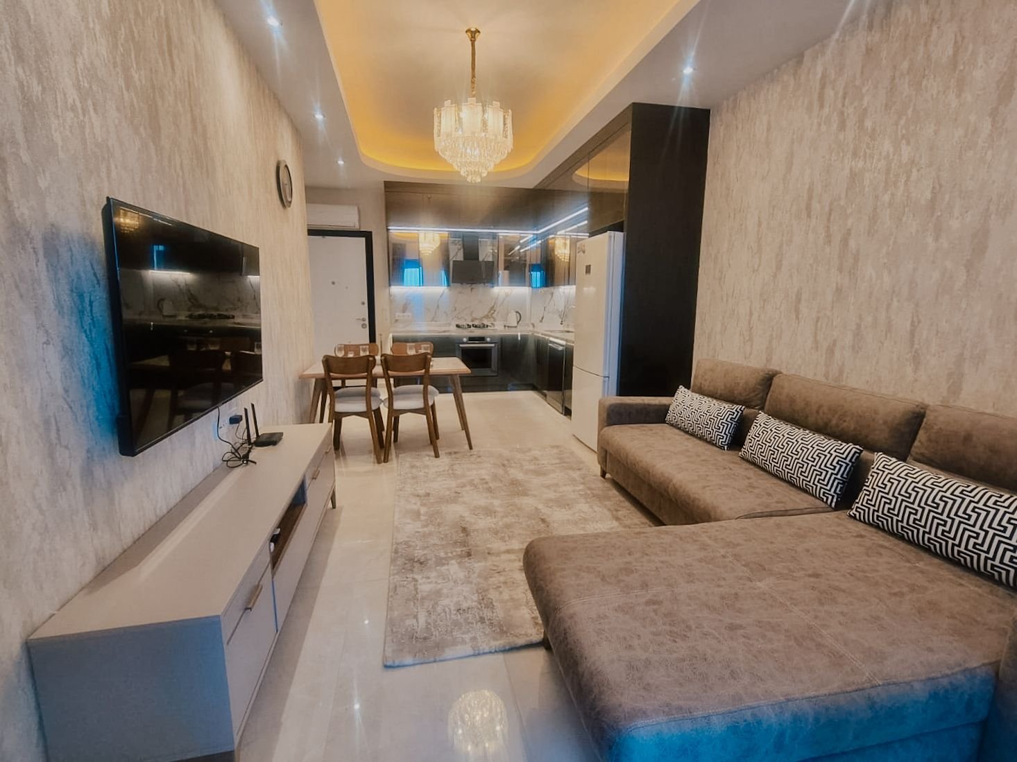 Квартира полностью подготовлена для посуточной аренды. Здесь есть всё, чтобы вы чувствовали себя как в хорошем отеле: вся необходимая мебель и техника, полный комплект посуды, чистое постельное бельё и полотенца, кондиционеры, телевизор и современное освещение. В гостиной — большой раскладной диван, в спальне — удобная полноценная кровать.