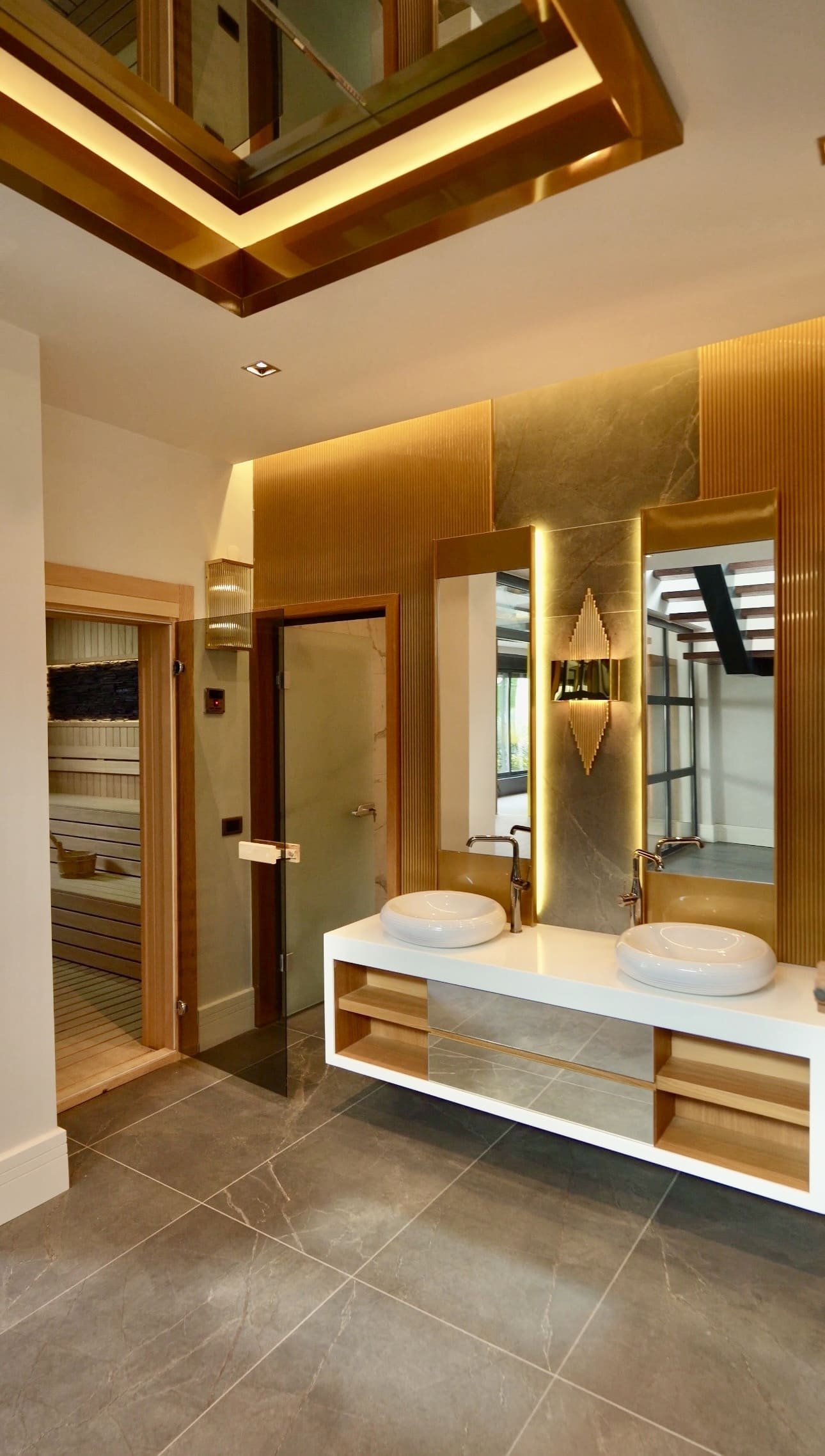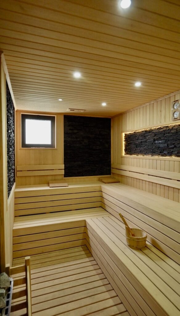 Планировка продумана для комфортной жизни семьи. На нулевом уровне расположена просторная гостиная с кухонной зоной, спальня и санузел. На втором этаже — две спальни, каждая со своим собственным санузлом, что создаёт максимальный комфорт и приватность. Отдельный уровень (-1 этаж) полностью отведён под зону отдыха и восстановления: здесь уже предусмотрены собственные сауна и хамам, а также пространство под спортзал.