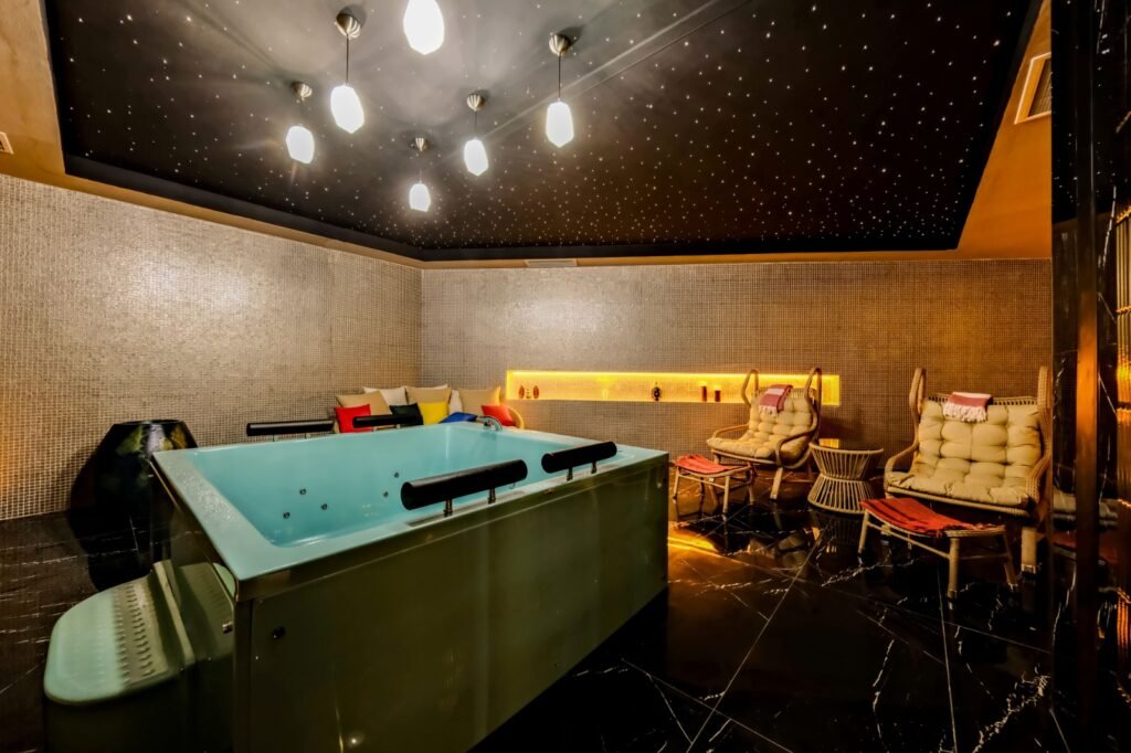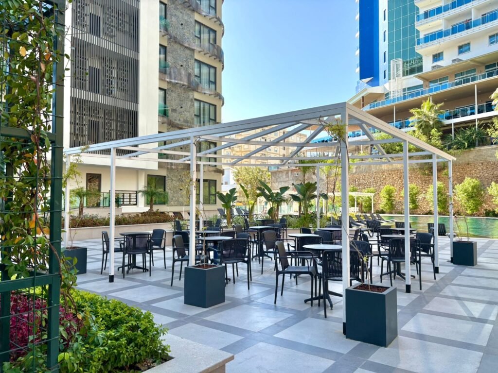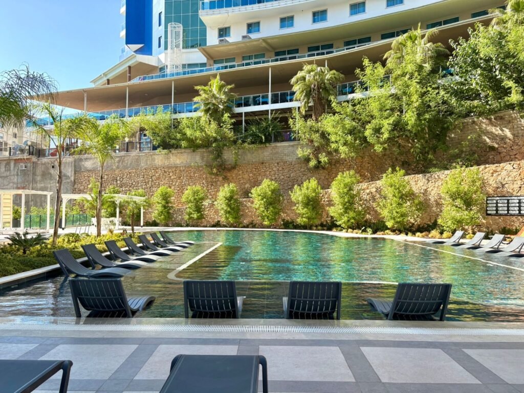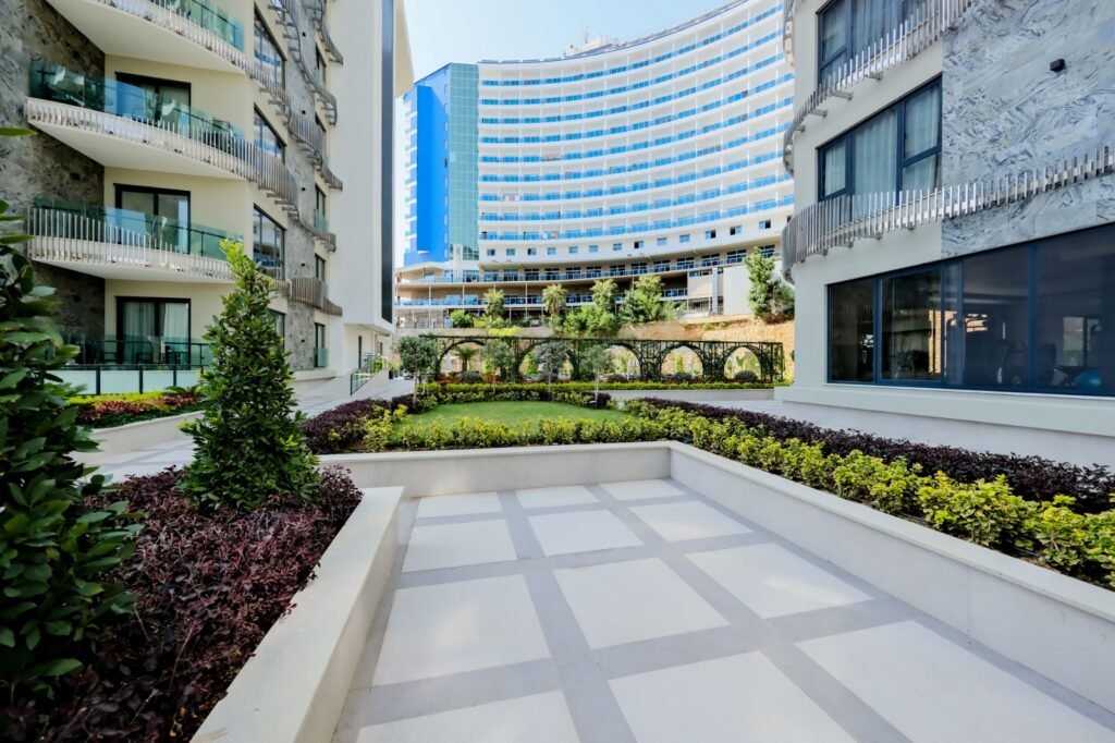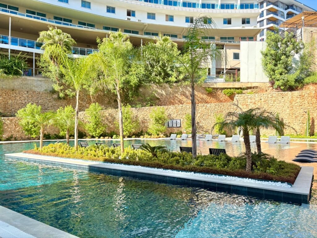 Комплекс занимает территорию 5.580 м² и предлагает инфраструктуру уровня премиум-класса. Жителям доступны большой открытый бассейн, детский бассейн, зоны джакузи, включая подогреваемые, а также полноценный SPA-центр с крытым бассейном, хамамом, сауной, паровой и массажными кабинетами. На территории есть фитнес-зал, кинотеатр, бильярд, детская игровая комната и площадка, кафе и уютное лобби. Безопасность обеспечивается круглосуточной охраной и видеонаблюдением, предусмотрены генератор, управляющий, Wi-Fi и спутниковое телевидение. Территория благоустроена и закрыта от посторонних.