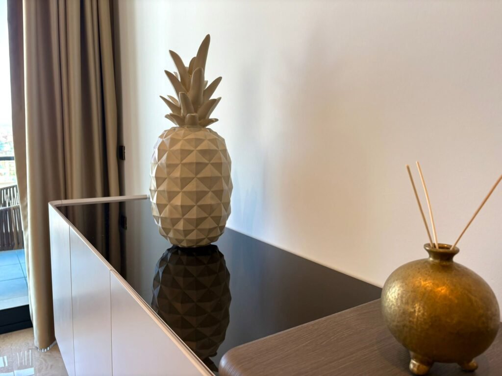 Квартира продумана до мелочей и полностью укомплектована для комфортной жизни. Установлена встроенная кухня и мебель, полный комплект бытовой техники Siemens, кондиционеры в каждой комнате, подогрев пола в ванных комнатах. Интерьер выполнен в современном стиле с акцентом на функциональность и уют. Два санузла и два балкона добавляют удобства, а расположение на верхнем этаже наполняет пространство светом и открывает приятные виды.