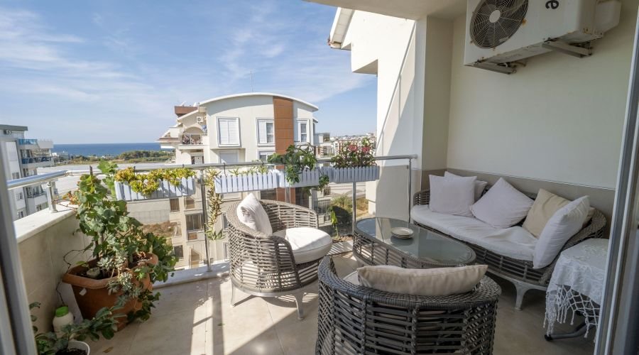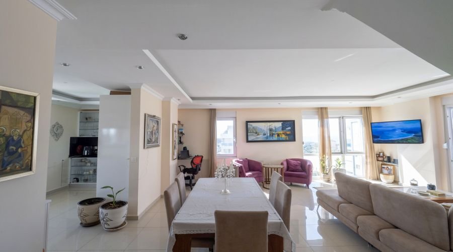 Квартира полностью меблирована и укомплектована бытовой техникой. Планировка включает просторную гостиную с кухней открытого типа, три спальни, ванную комнату и удобные жилые зоны. Дополнительным преимуществом является просторная терраса с видом на море, которая расширяет жилое пространство и делает квартиру особенно привлекательной.