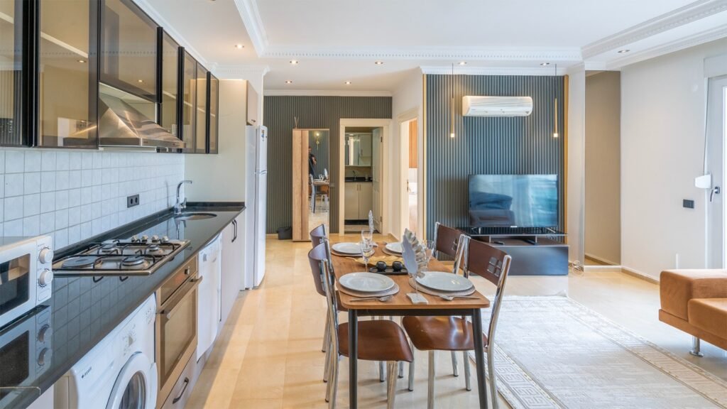 Светлая квартира планировки 1+1 площадью 70 м² расположена на 2 этаже в небольшом ухоженном комплексе. Квартира полностью меблирована, интерьер выполнен в современном спокойном стиле, видно, что жильё делали для себя — всё аккуратно, продуманно и в хорошем состоянии. Главное преимущество объекта — большая терраса с приятным видом на город, которая добавляет ощущение простора и делает квартиру особенно комфортной для жизни.