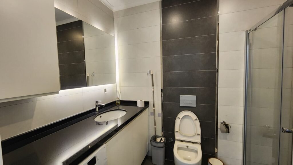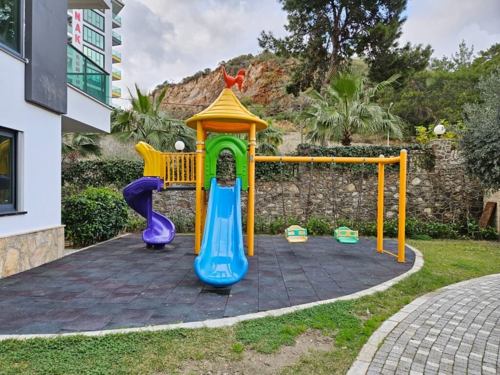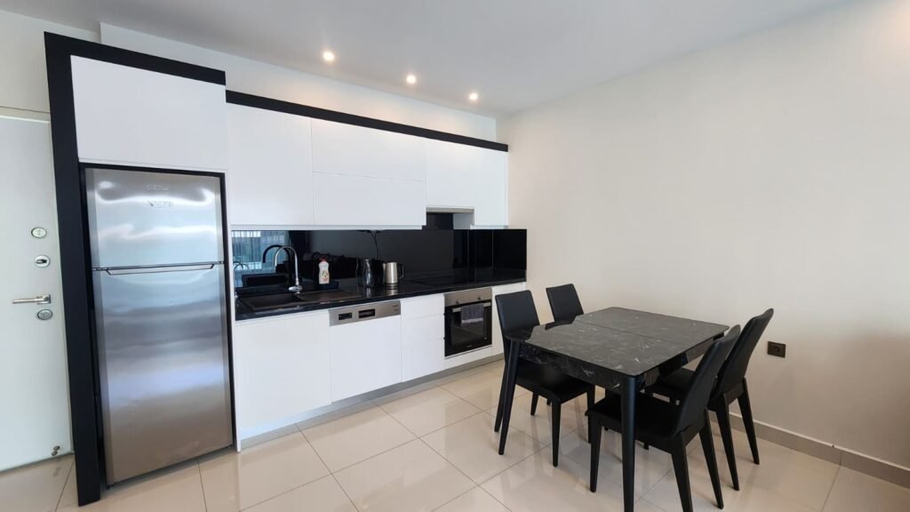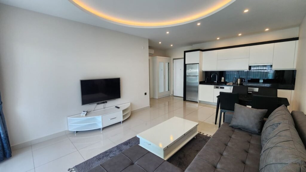 Mutfak alanı bulunan aydınlık bir oturma odası, ayrı bir yatak odası, modern bir banyo ve yeşilliklere ve havuza bakan geniş bir balkon. Daire tamamen dolu; mutfak gereçleri, yatak takımları, ütü ve saç kurutma makinesi mevcut.