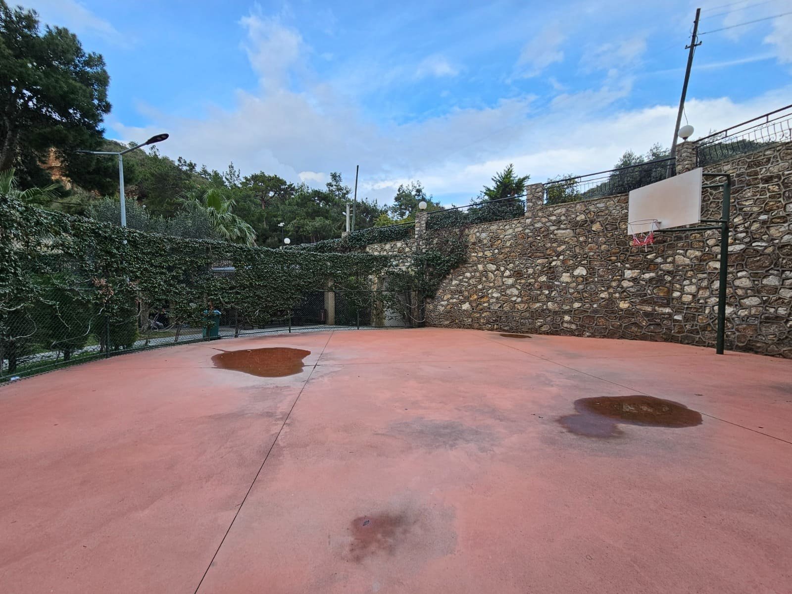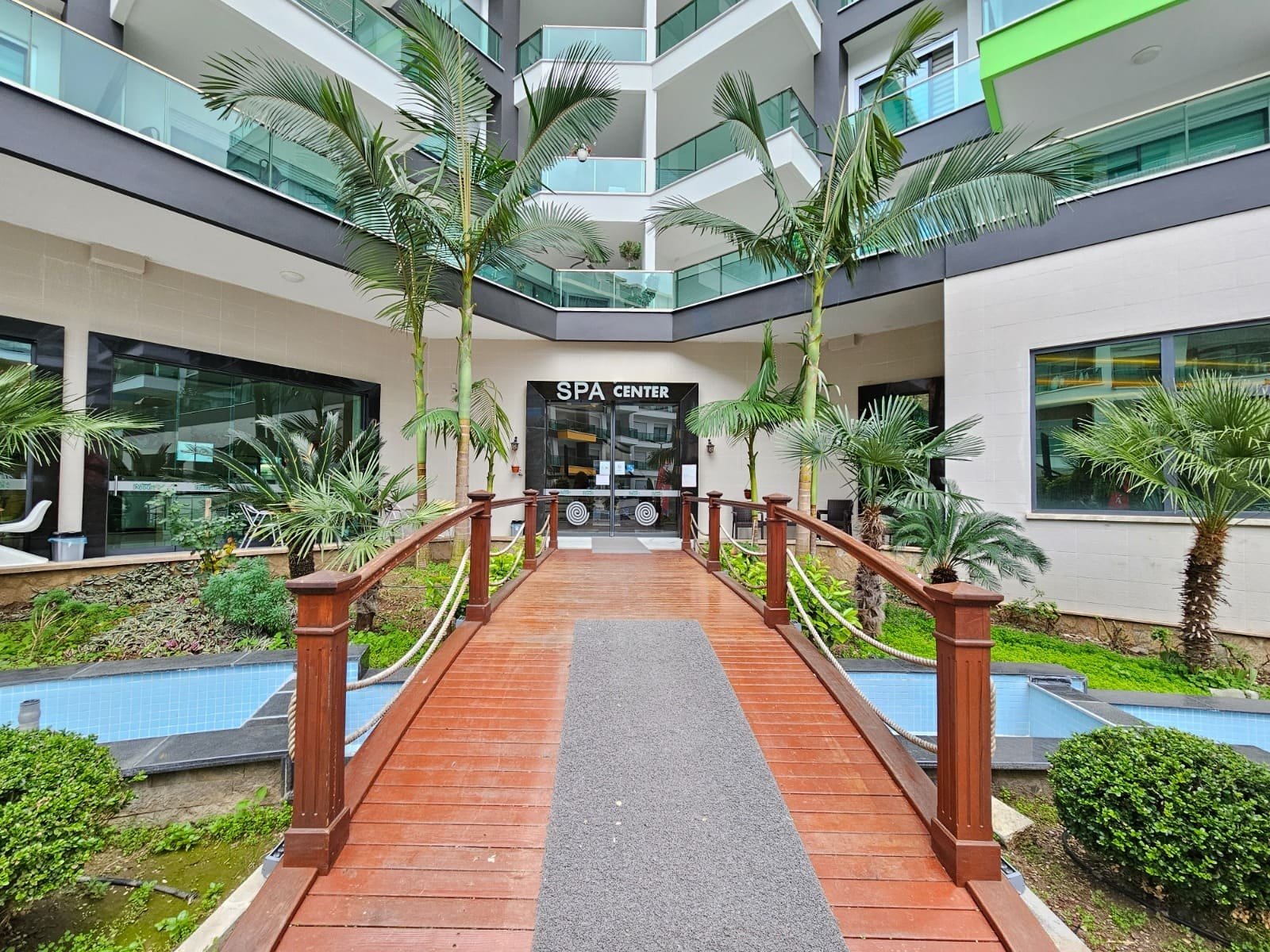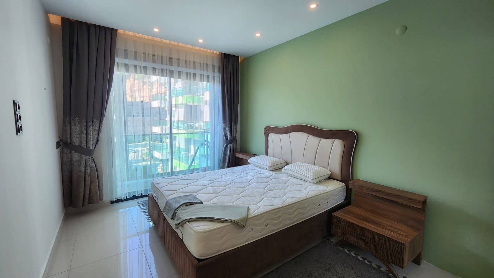 Mutfak alanı bulunan aydınlık bir oturma odası, ayrı bir yatak odası, modern bir banyo ve yeşilliklere ve havuza bakan geniş bir balkon. Daire tamamen dolu; mutfak gereçleri, yatak takımları, ütü ve saç kurutma makinesi mevcut.
