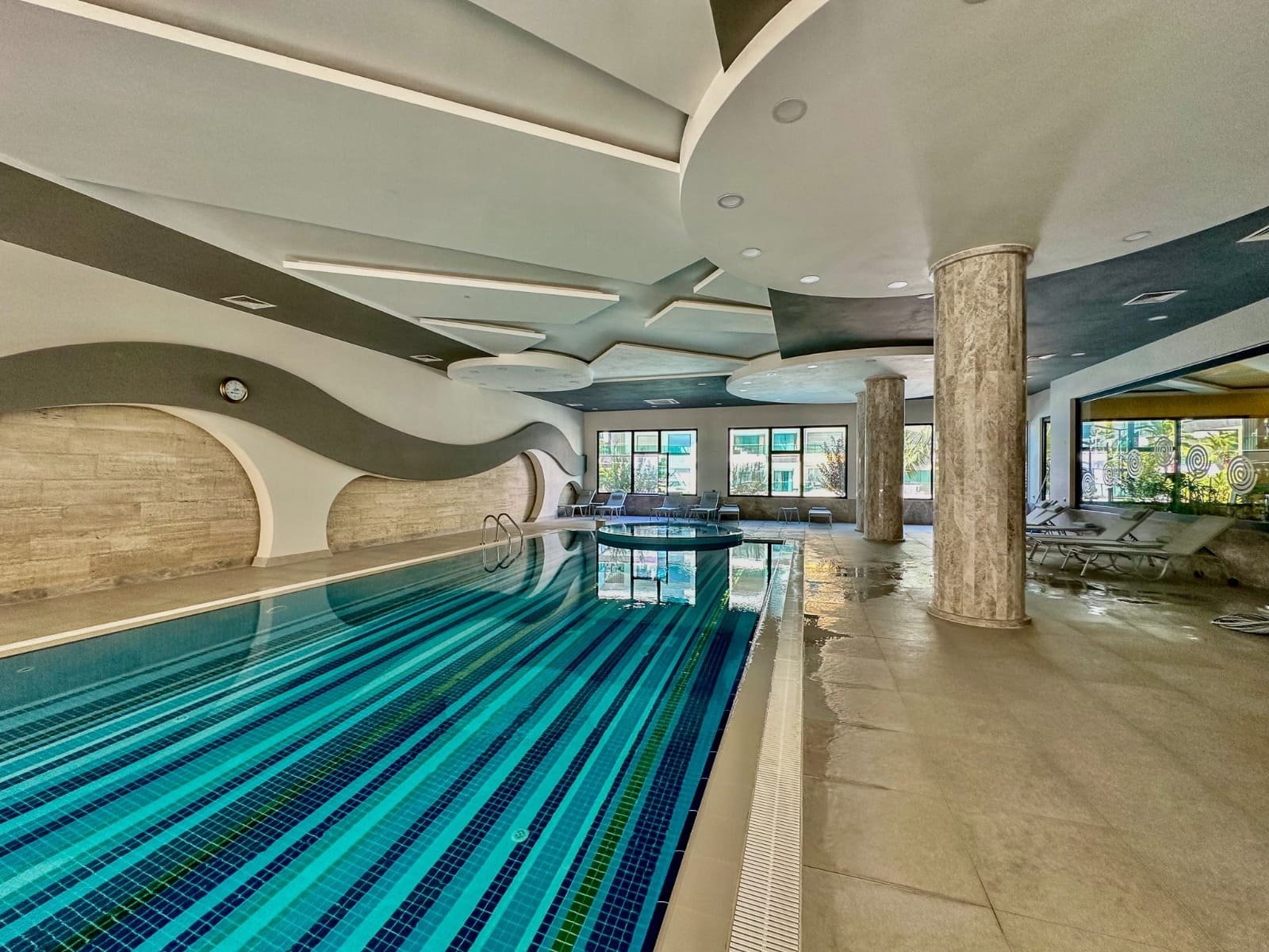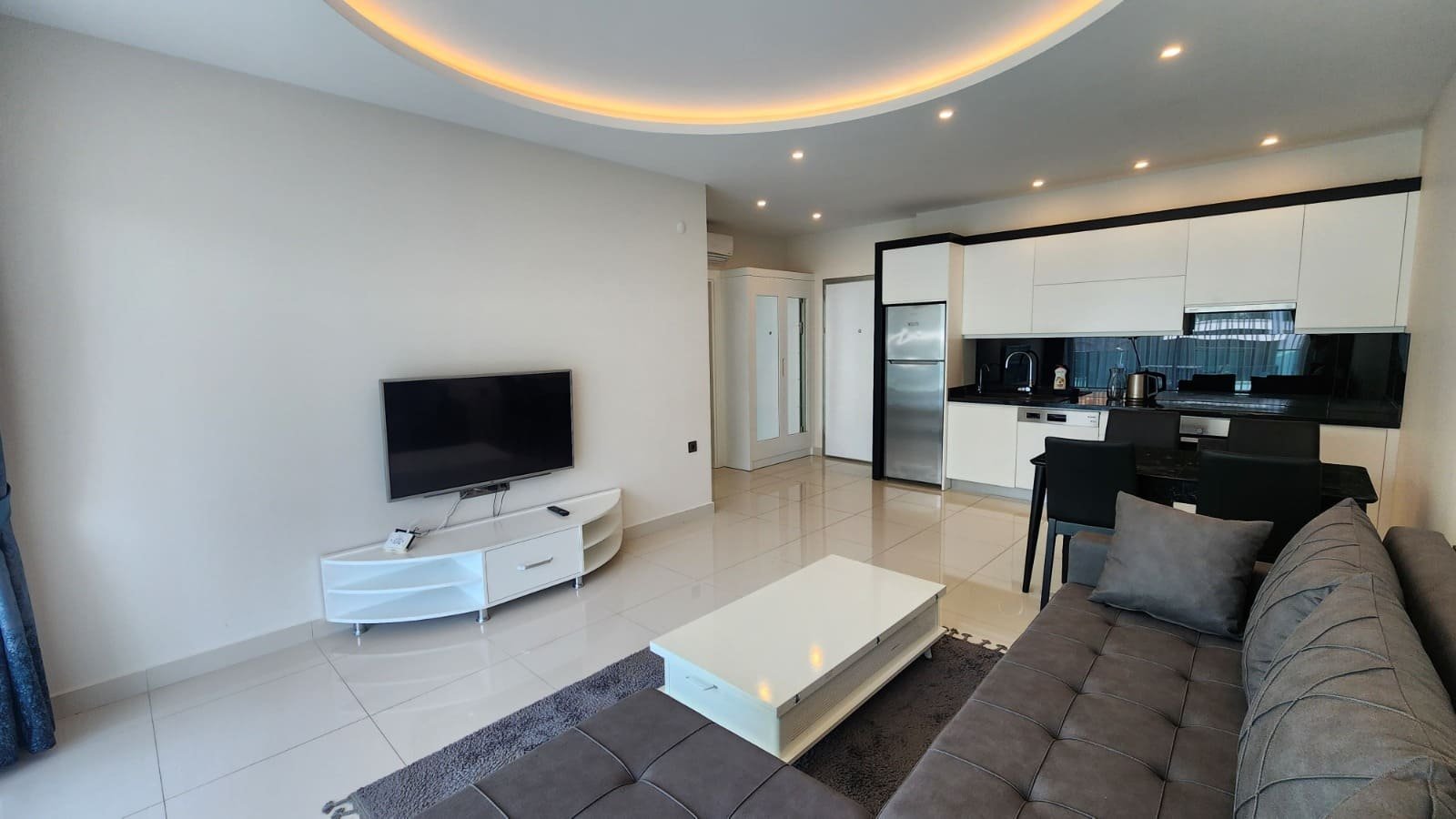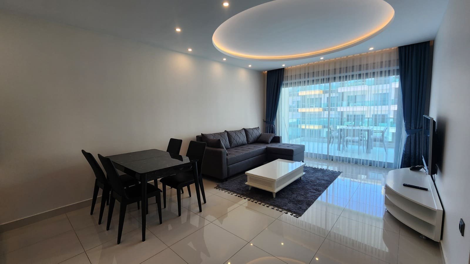 Bu modern ve rahat 65 metrekarelik tek yatak odalı daire, tatil köyü kalitesinde olanaklara sahip bir konut kompleksinin 4. katında yer almaktadır. Havuza bakan geniş balkonu, şık tasarımı ve rahat atmosferiyle, deniz kenarında yaşamak için mükemmel bir seçimdir.