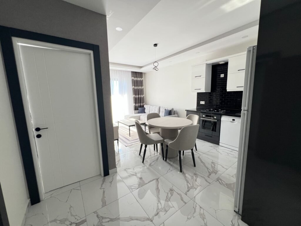İç mekan modern ve aydınlık bir tarzda tasarlanmıştır. Geniş oturma odası mutfak alanıyla birleştirilmiş olup, denize ve yeşilliklere bakan bir balkona açılmaktadır. Yatak odası, geniş bir pencere ve önceden döşenmiş mobilyalarla rahat bir ortam sunmaktadır. Banyo, modern dokunuşlarla yenilenmiştir. Ana alanlar tamamen kullanıma hazırdır; geriye sadece birkaç cihazı kurmak ve isteklerinize göre detaylar eklemek kalmıştır.
