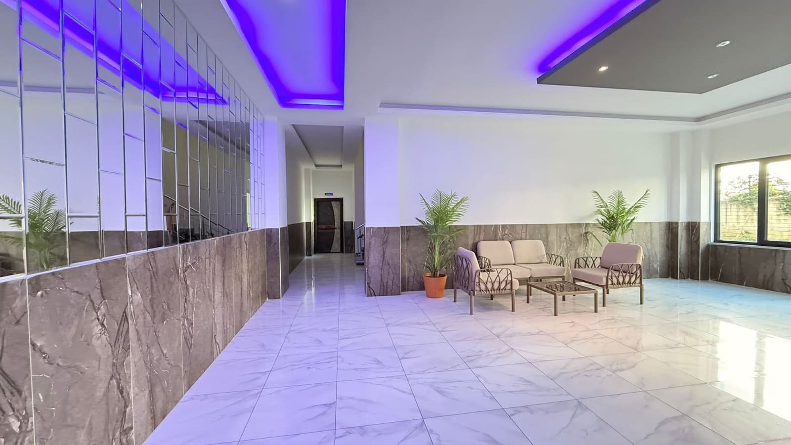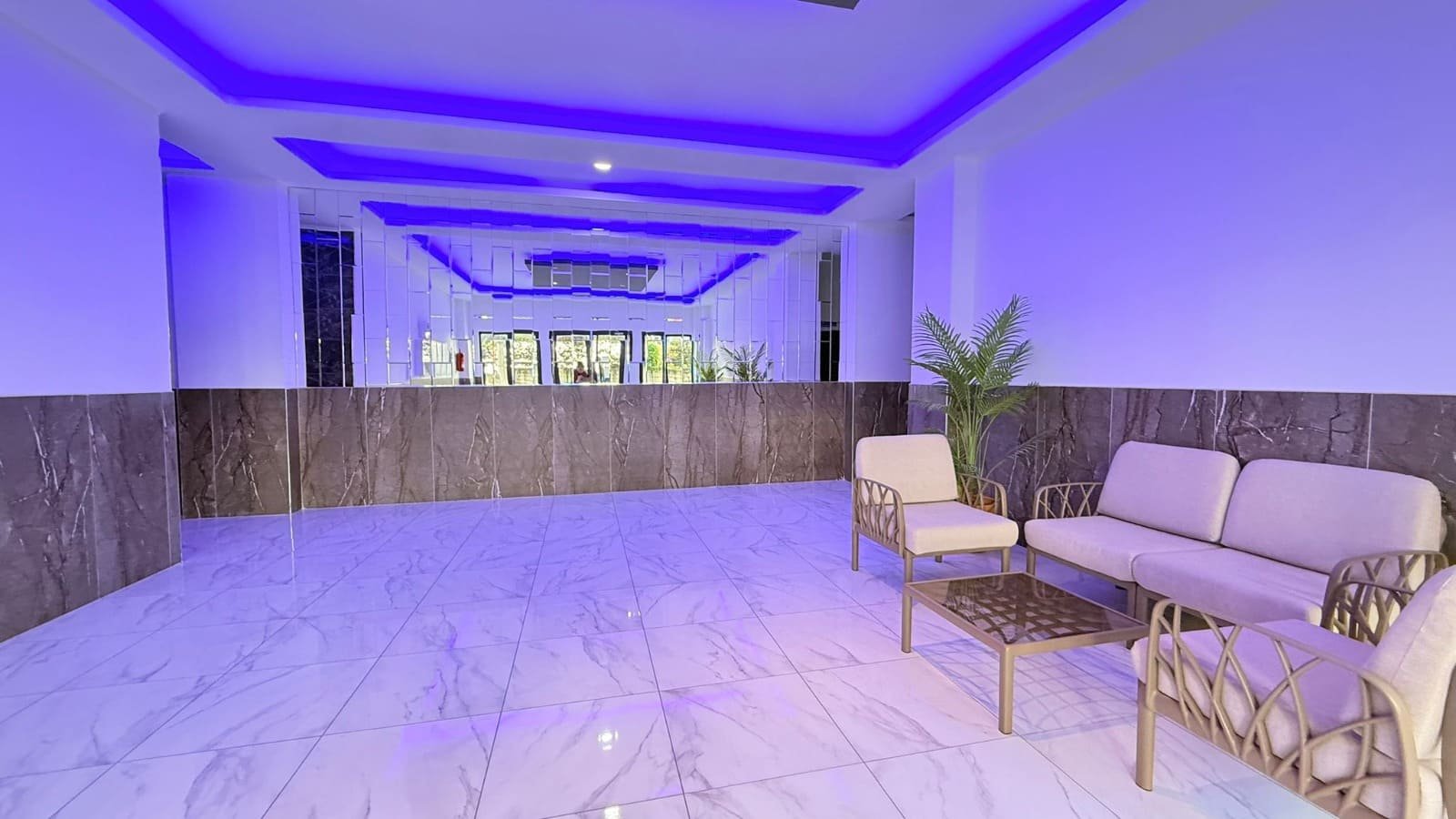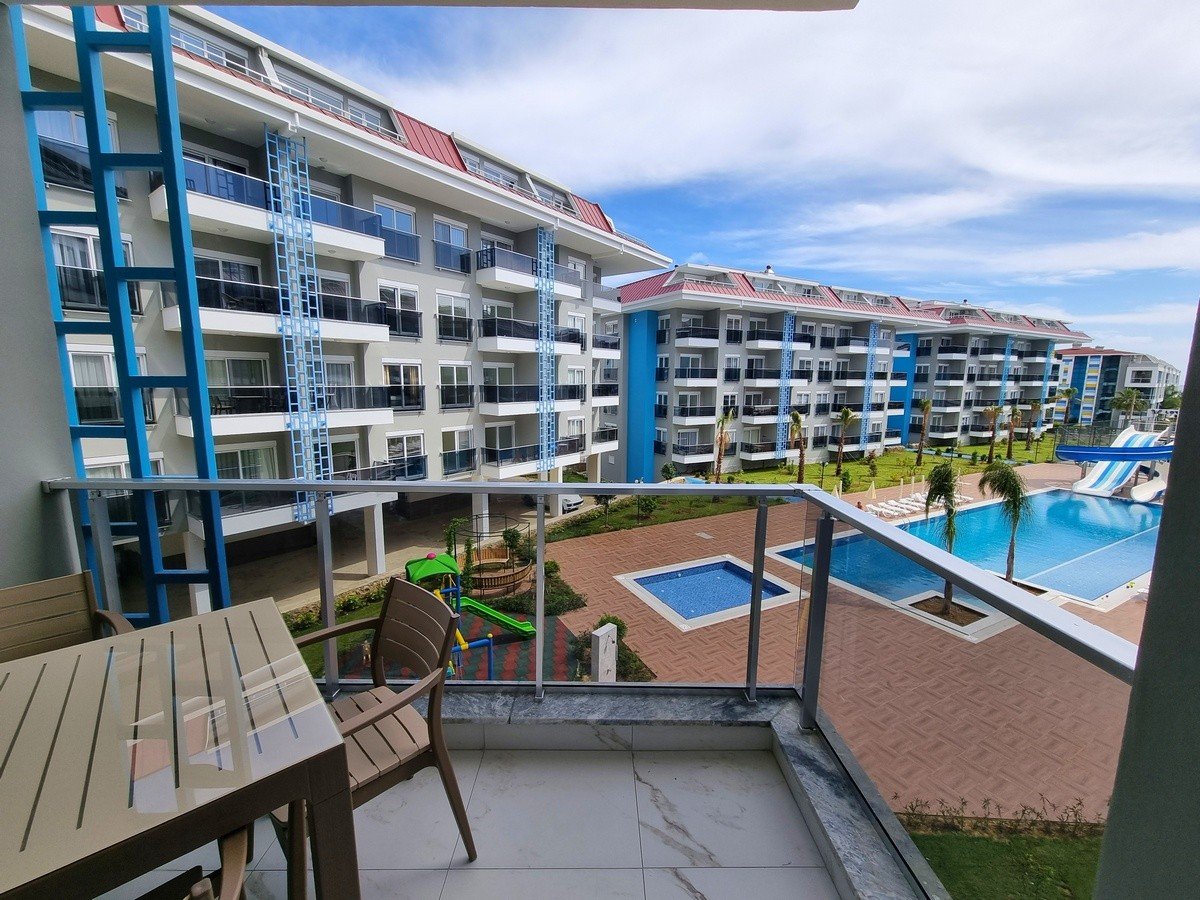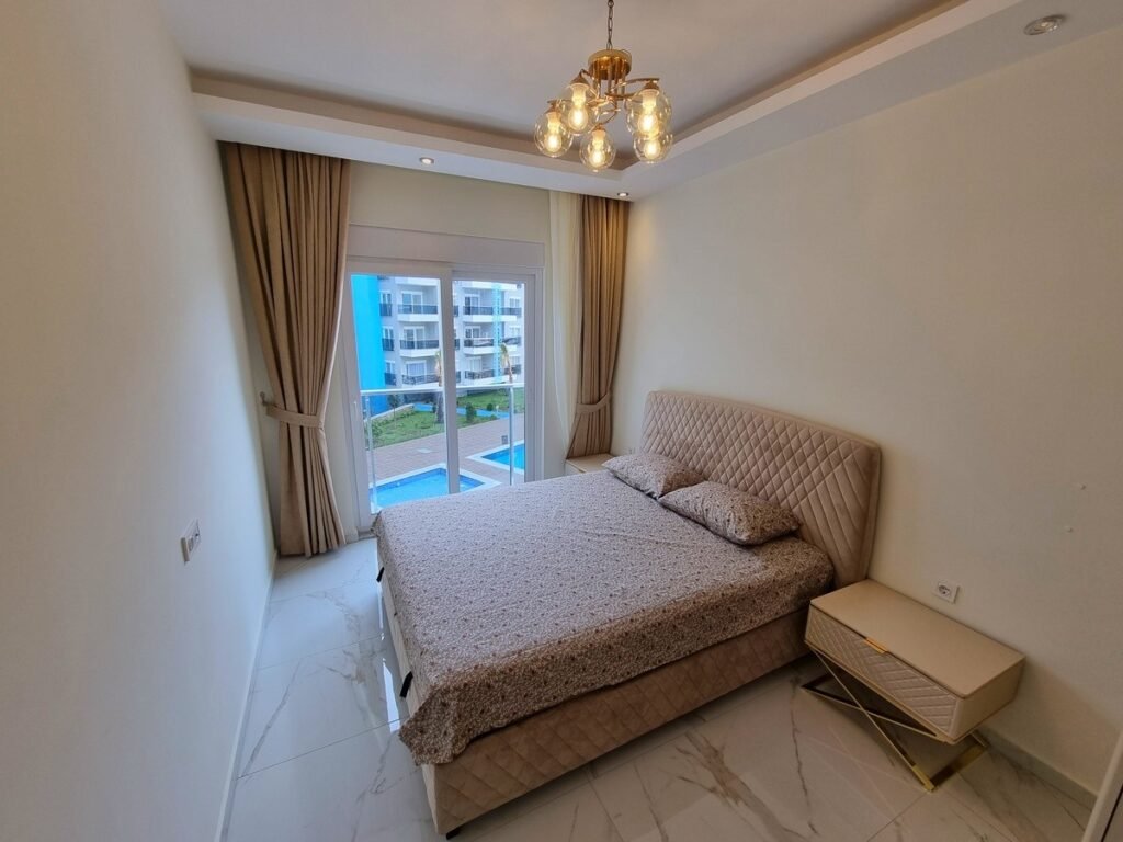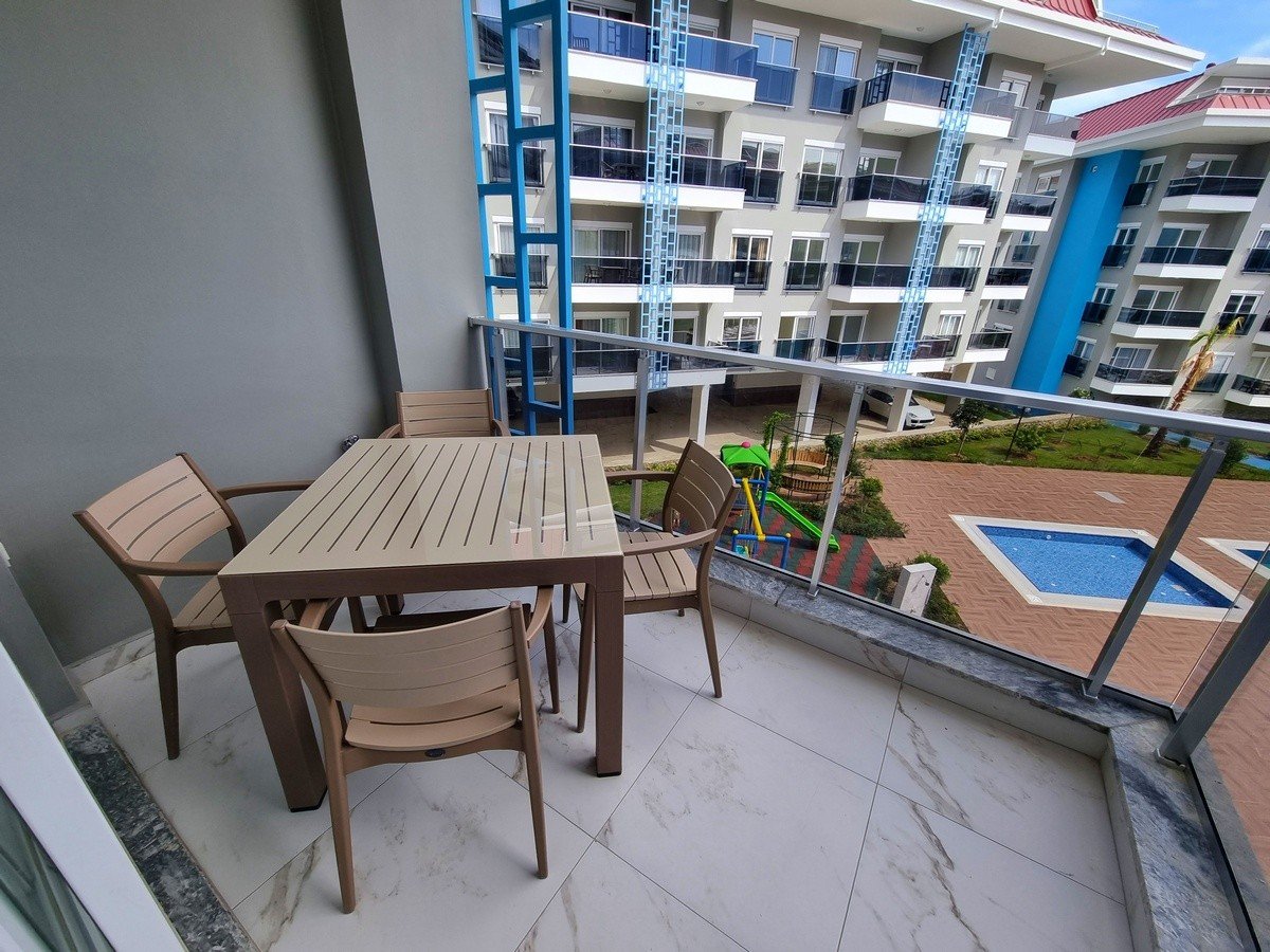 Апартаменты расположены на высоком 1 этаже. Планировка 1+1 имеет площадь 60 м2 и включает в себя совмещённую с кухней гостиную комнату, спальню, ванную комнату и балкон с видом на территорию, сад и бассейн. В квартире есть интернет, умный телевизор и все принадлежности для комфортного проживания.