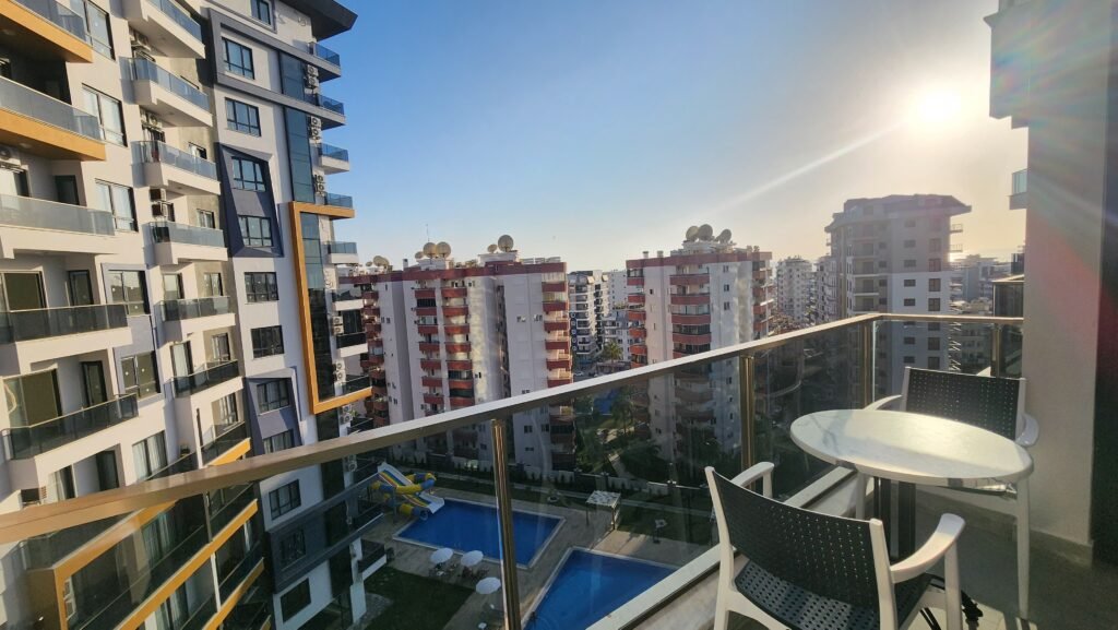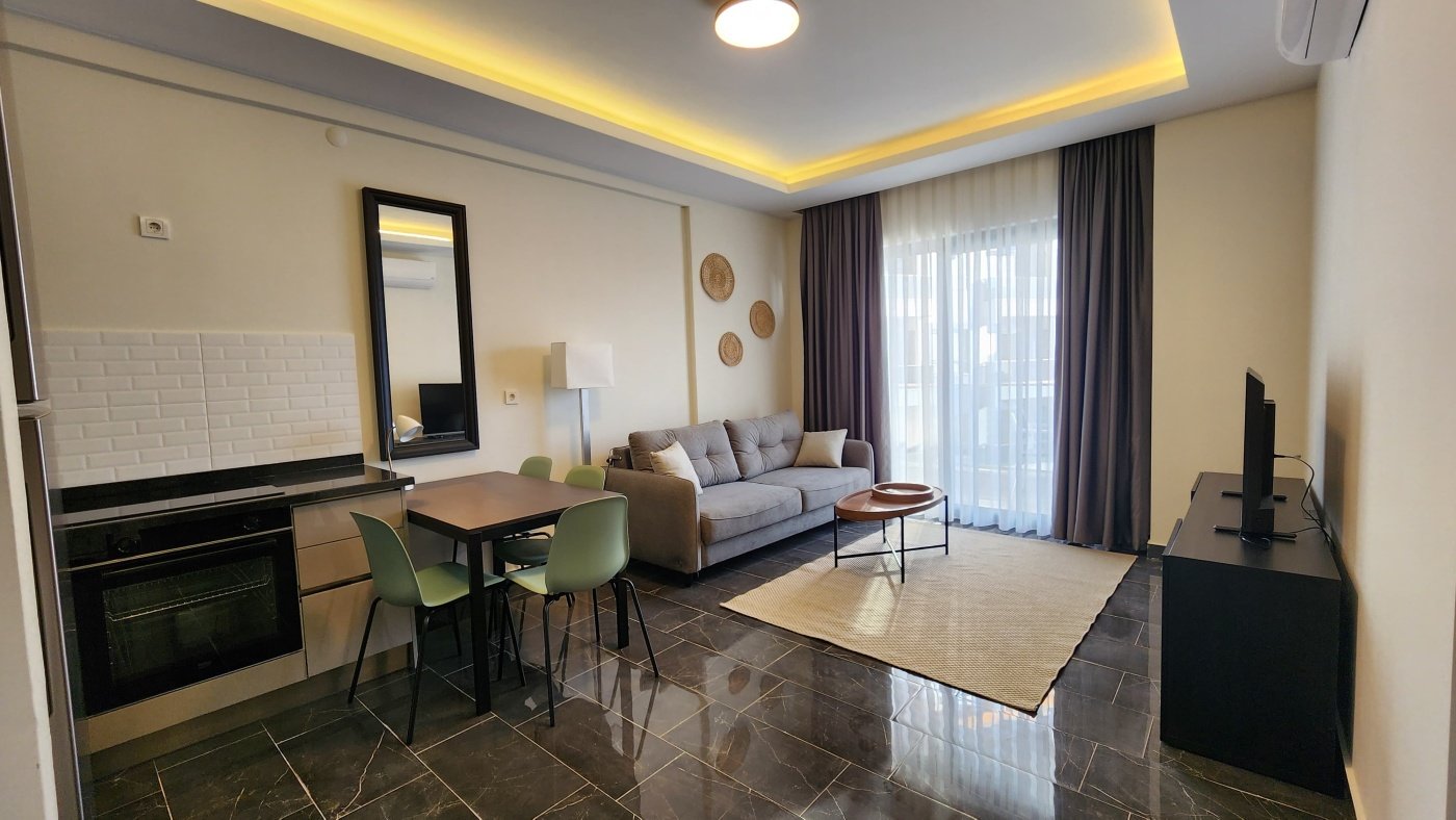 Полностью меблированные апартаменты планировки 1+1 с видом на бассейн на 6 этаже в современном жилом комплексе 2024 года постройки.