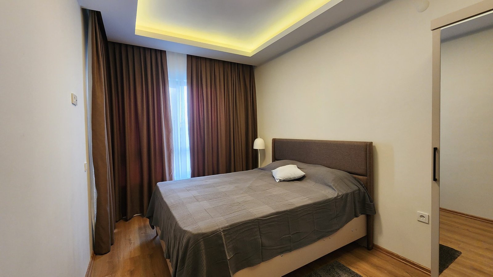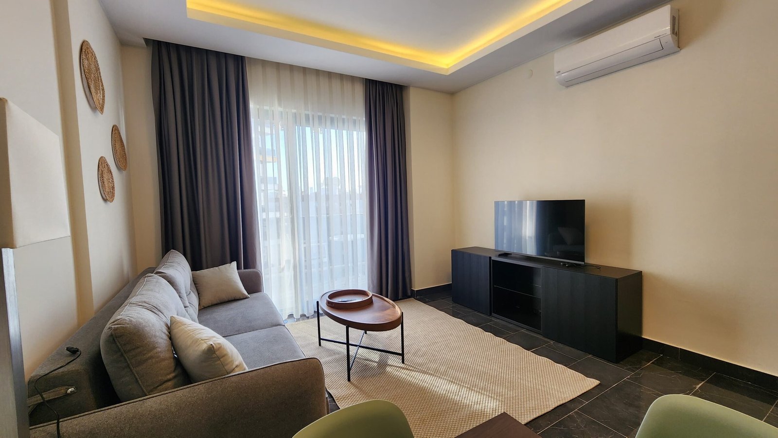 Апартаменты находятся на 6 этаже. Планировка 1+1 включает в себя совмещённую с кухней гостиную комнату, спальню, ванную комнату и балкон с видом Средиземное море, город, территорию комплекса, бассейн. Квартира имеет всё необходимые удобства для проживания. Стоимость электроэнергии, воды и генеральная уборка после выселения оплачивается отдельно.