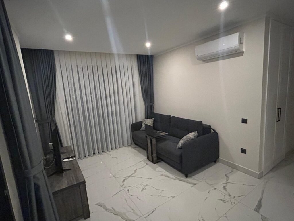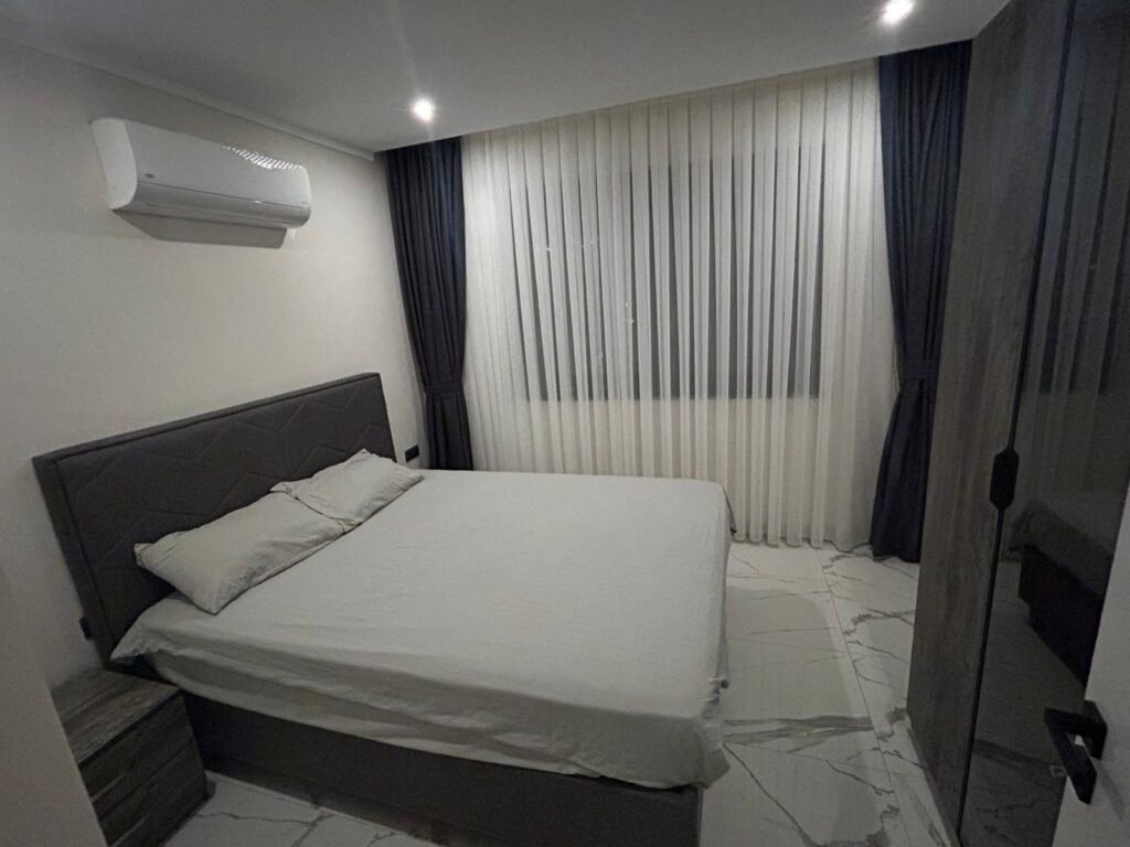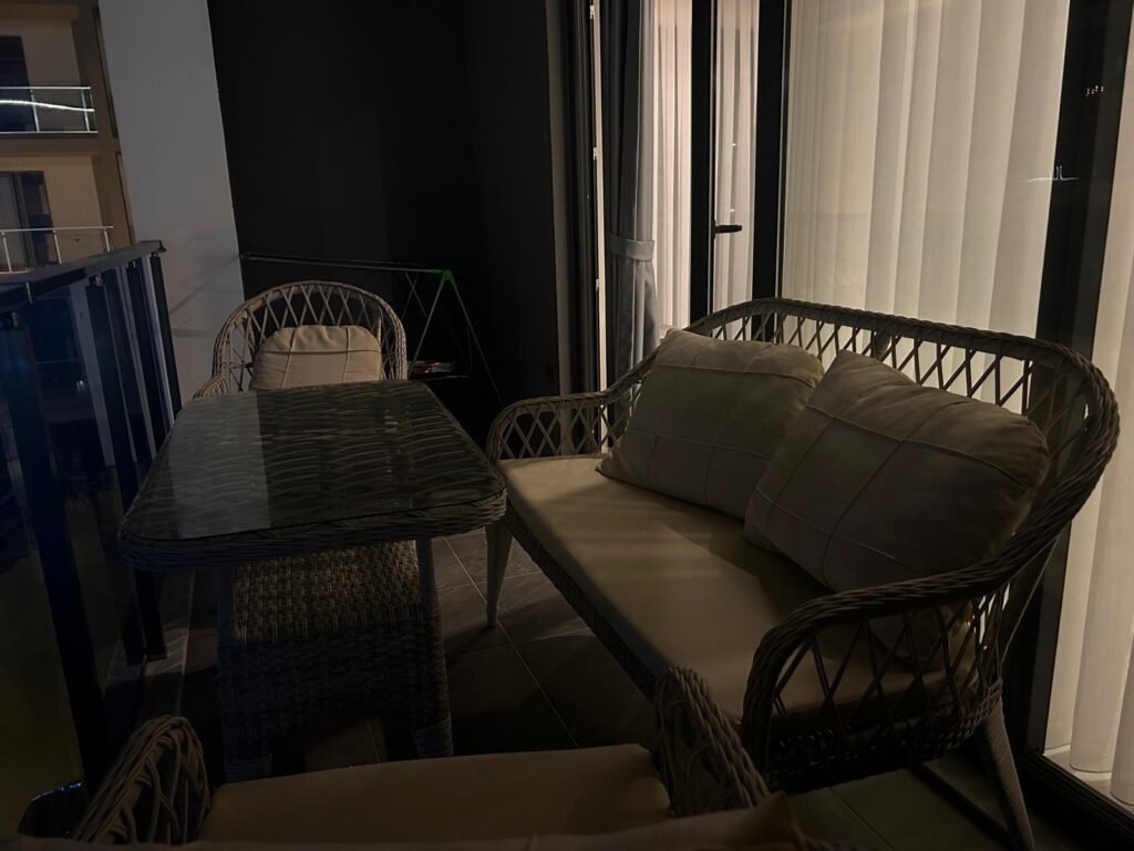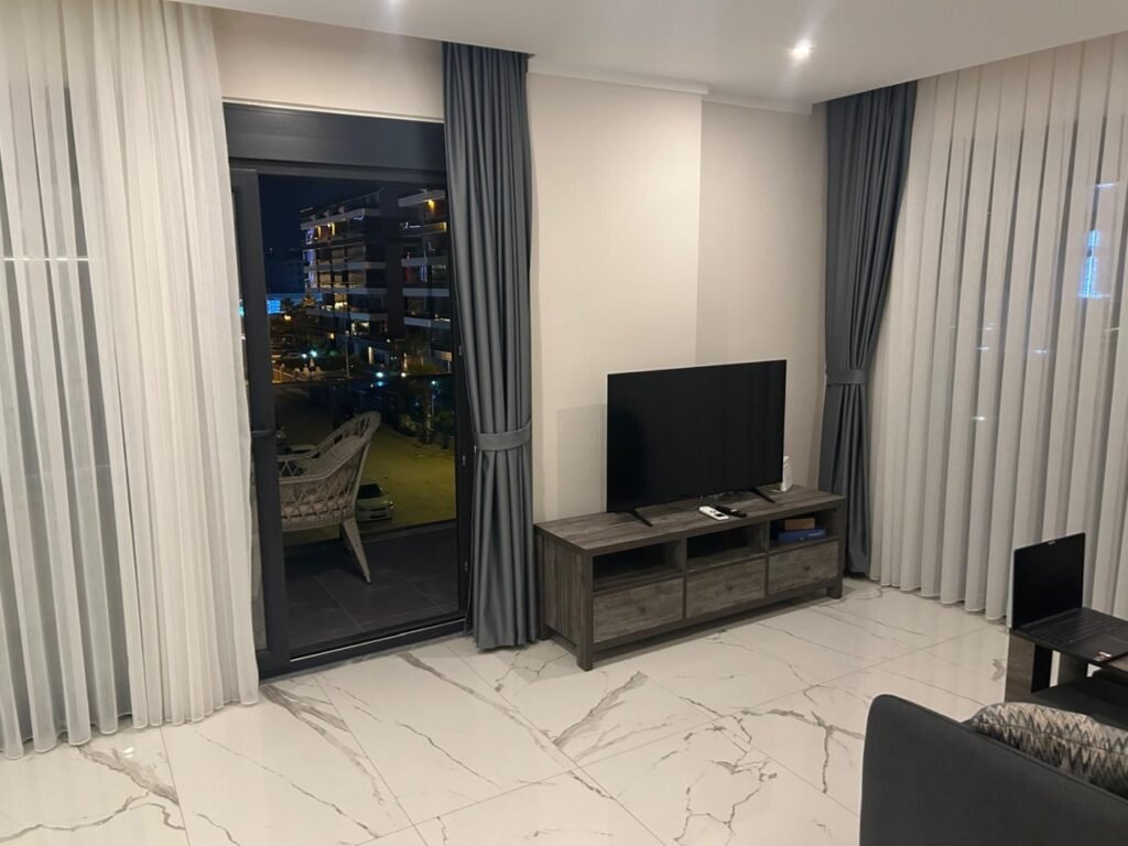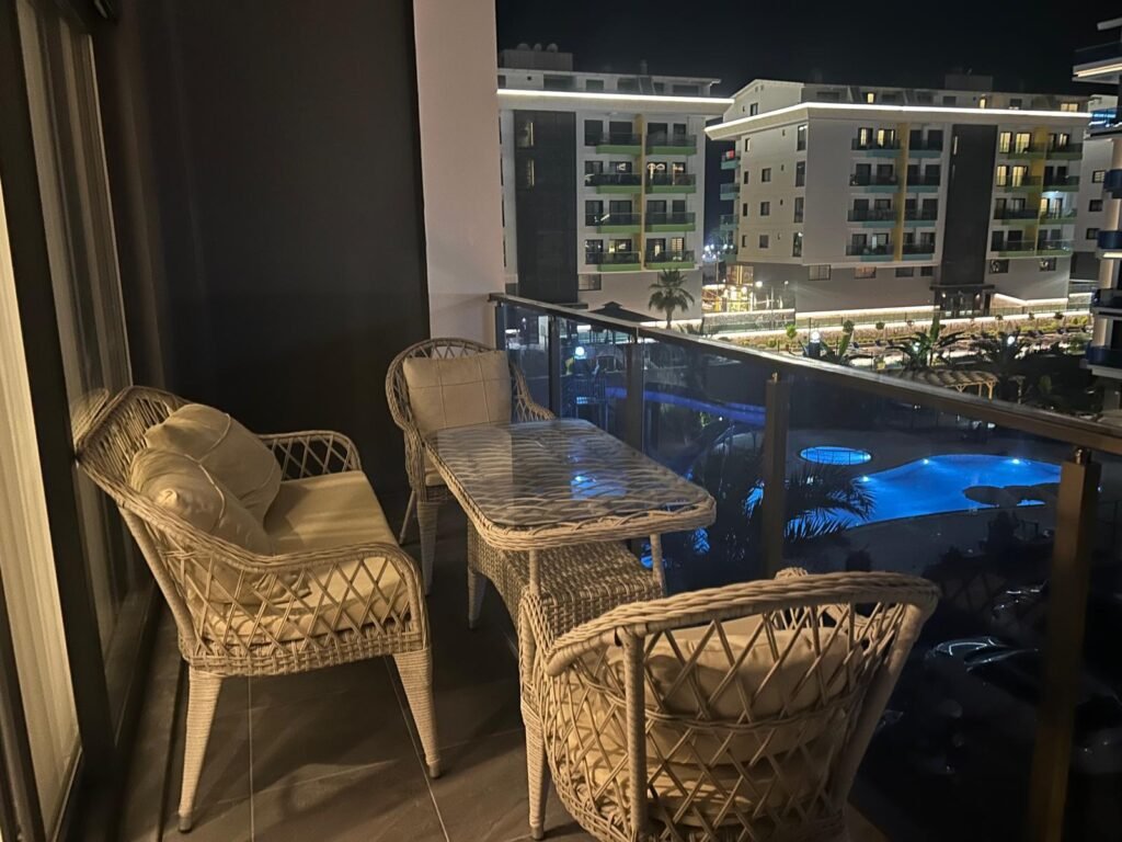 Апартаменты находятся на 3 этаже. Планировка 1+1 включает в себя совмещённую с кухней гостиную комнату, спальню, ванную комнату и балкон с видом на территорию и бассейн комплекса. Квартира полностью меблирована и оборудована бытовой техникой, что делает ее готовой к заселению. Она станет вашим личным уютным уголком прямо у берега моря. Стоимость электроэнергии, воды и генеральная уборка после выселения оплачивается отдельно.