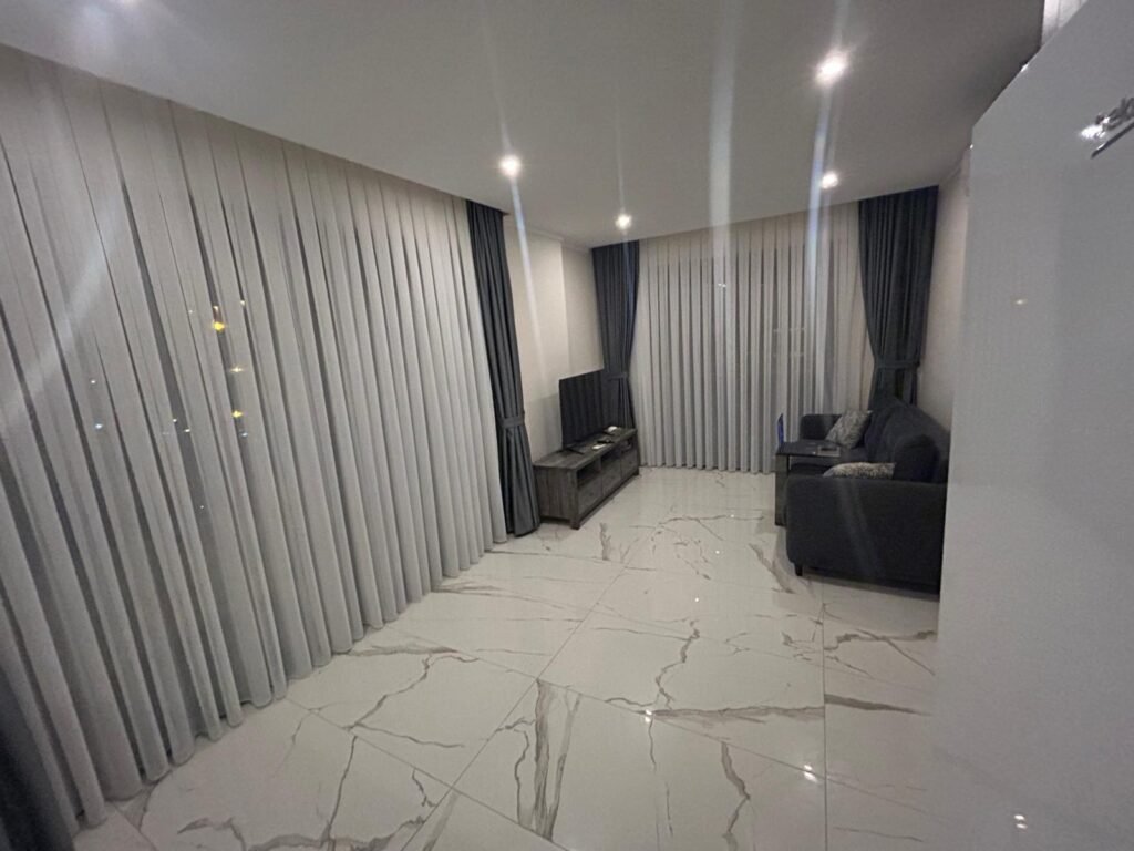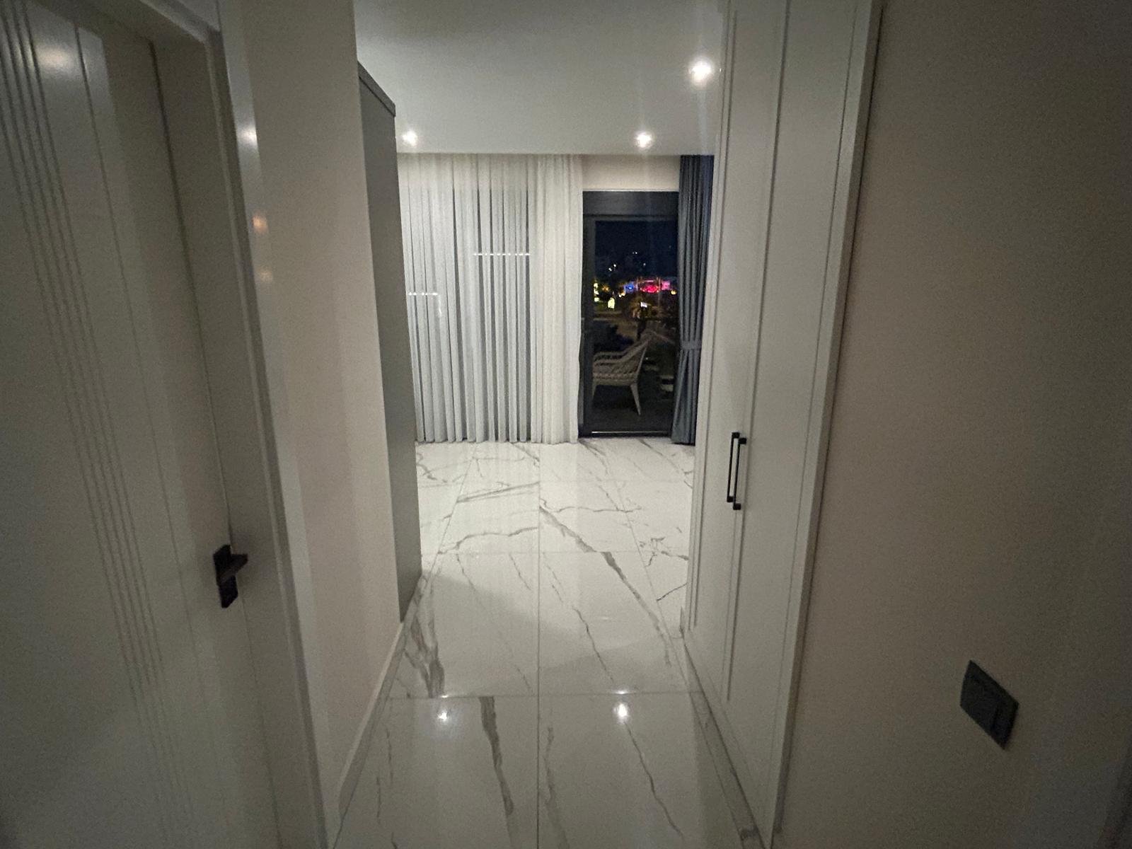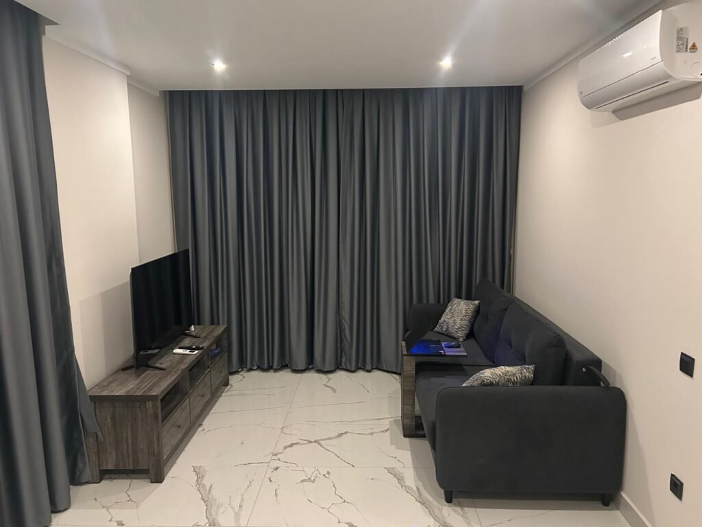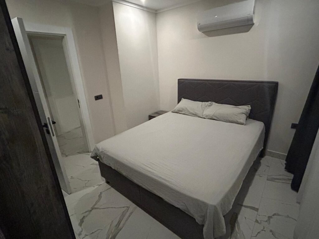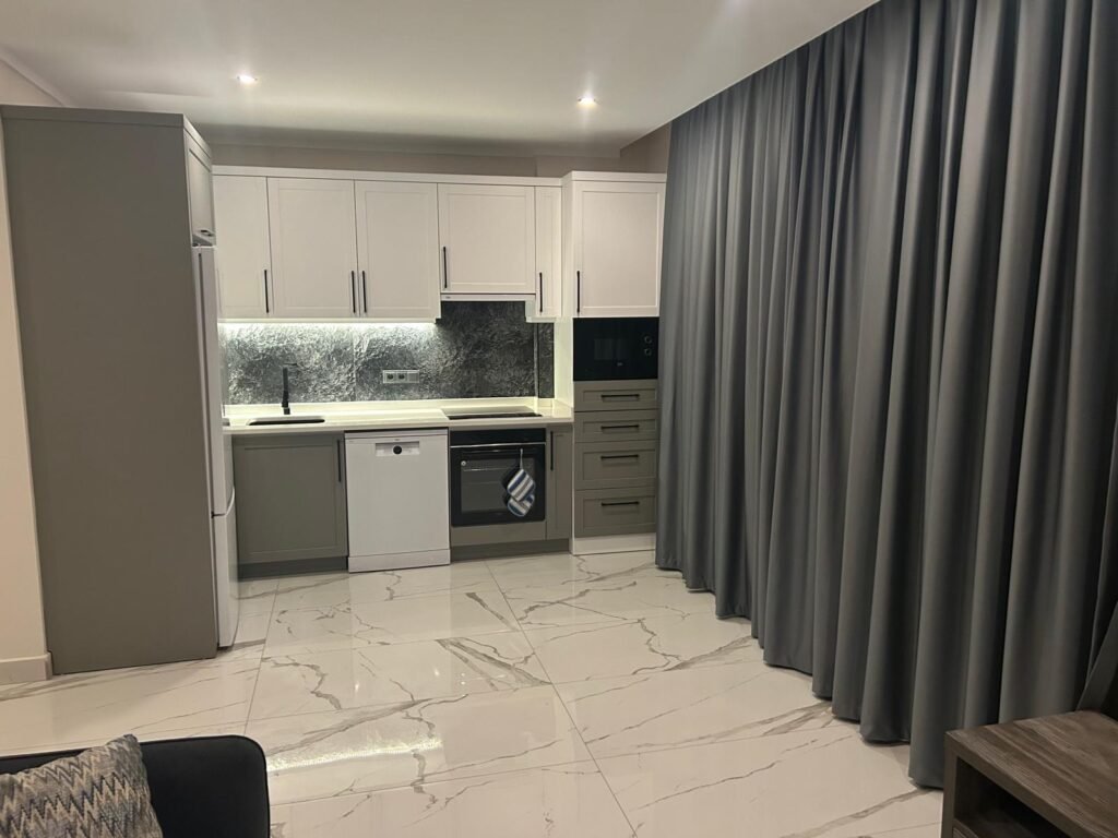 Апартаменты находятся на 3 этаже. Планировка 1+1 включает в себя совмещённую с кухней гостиную комнату, спальню, ванную комнату и балкон с видом на территорию и бассейн комплекса. Квартира полностью меблирована и оборудована бытовой техникой, что делает ее готовой к заселению. Она станет вашим личным уютным уголком прямо у берега моря. Стоимость электроэнергии, воды и генеральная уборка после выселения оплачивается отдельно.