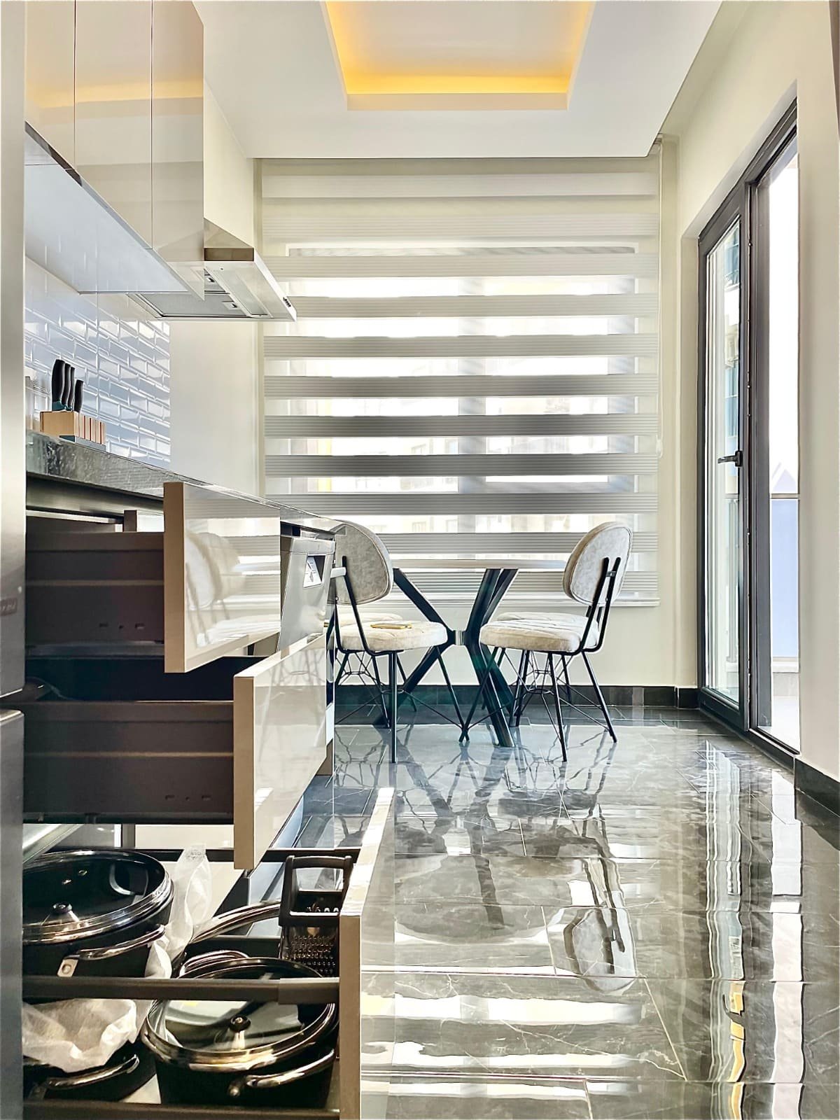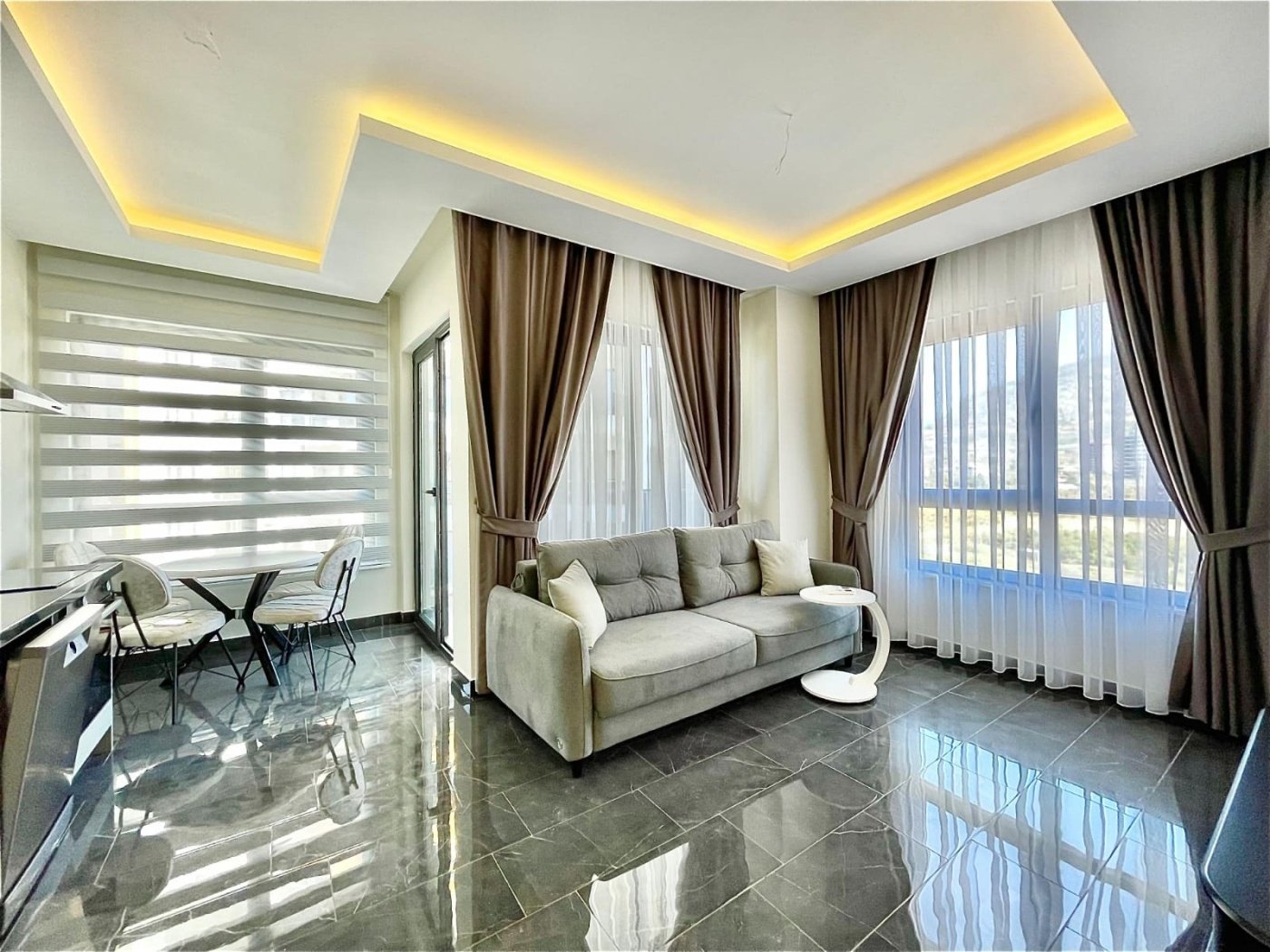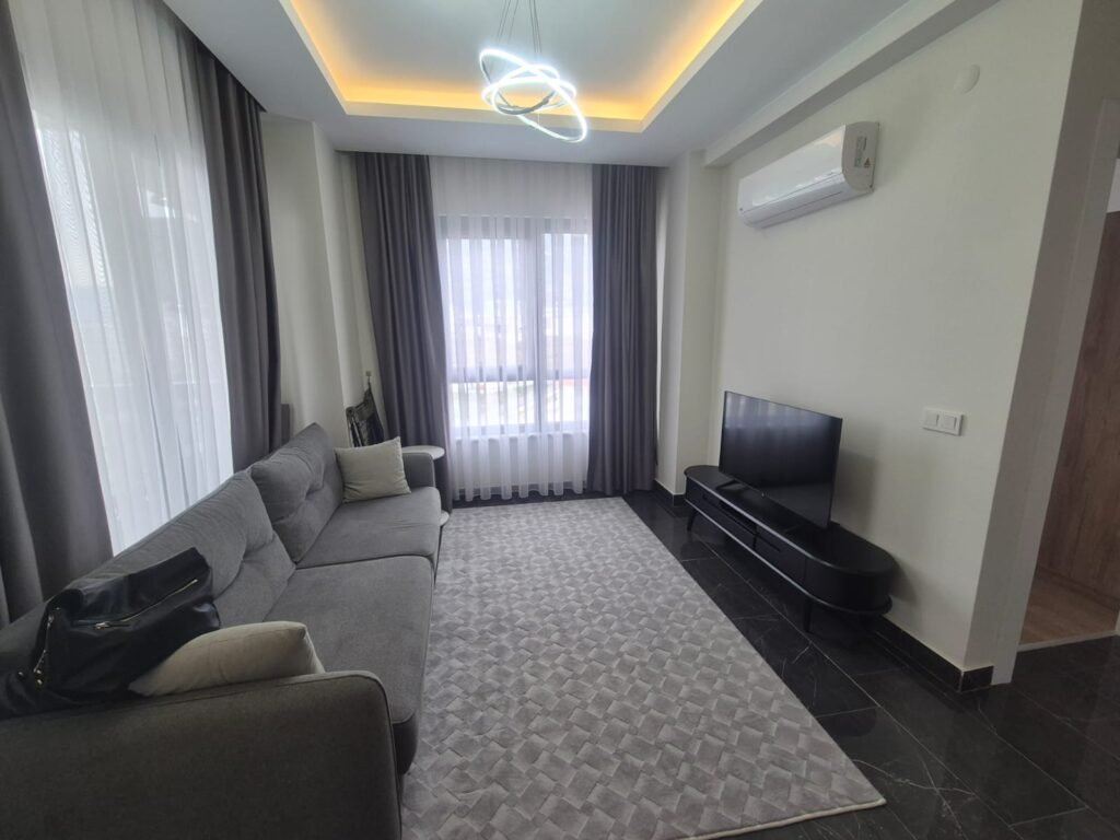 Апартаменты находятся на 5 этаже и включают в себя светлую гостиную с кухонной зоной, уютную спальню, современную ванную комнату и просторный балкон с живописным видом на горные пейзажи. Квартира полностью меблирована и оборудована всем необходимым для комфортного проживания. Коммунальные расходы и финальная уборка после выезда оплачиваются отдельно.
