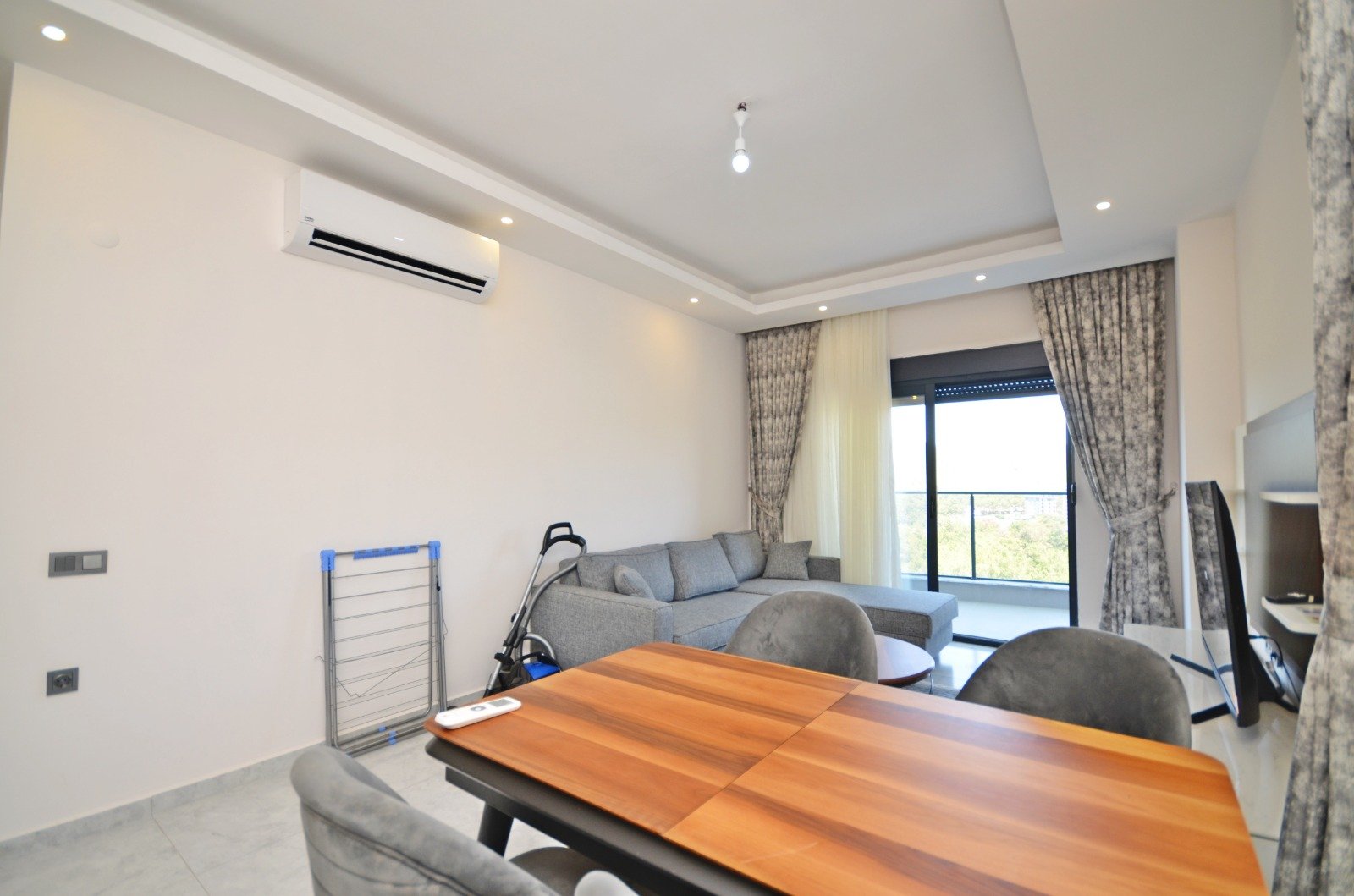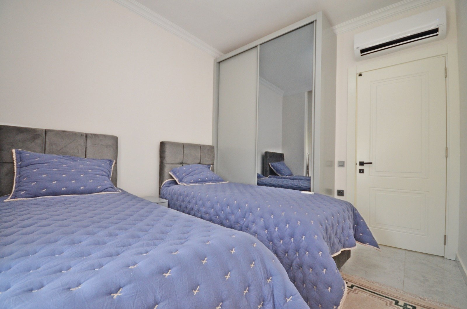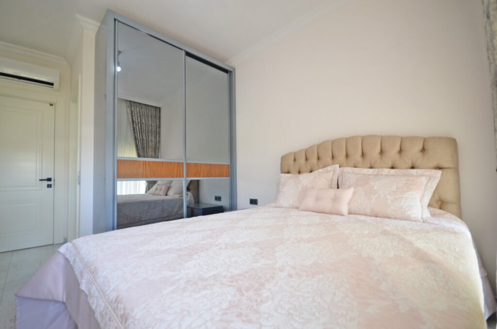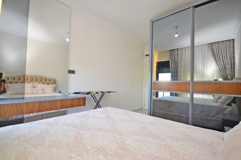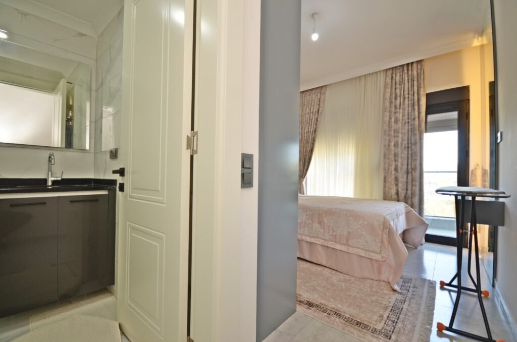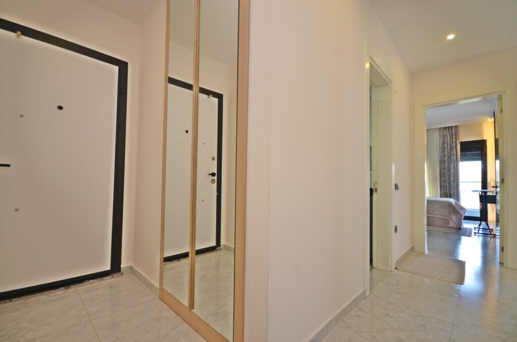 Квартира планировки 2+1 площадью 85 м² расположена на 6 этаже и полностью меблирована. Пространство продумано для комфортного отдыха: светлая гостиная с кухонной зоной, две спальни, два санузла и балкон с приятными видами на море и территорию комплекса. В отделке использованы качественные материалы: керамические полы, аккуратные подвесные потолки с подсветкой, надёжные окна с двойным остеклением, бронированная входная дверь. Кухня оборудована встроенным гарнитуром с гранитной столешницей, ванные комнаты полностью укомплектованы сантехникой, мебелью и душевыми кабинами. Квартира выглядит ухоженной, стильной и полностью готовой к проживанию — без дополнительных вложений.