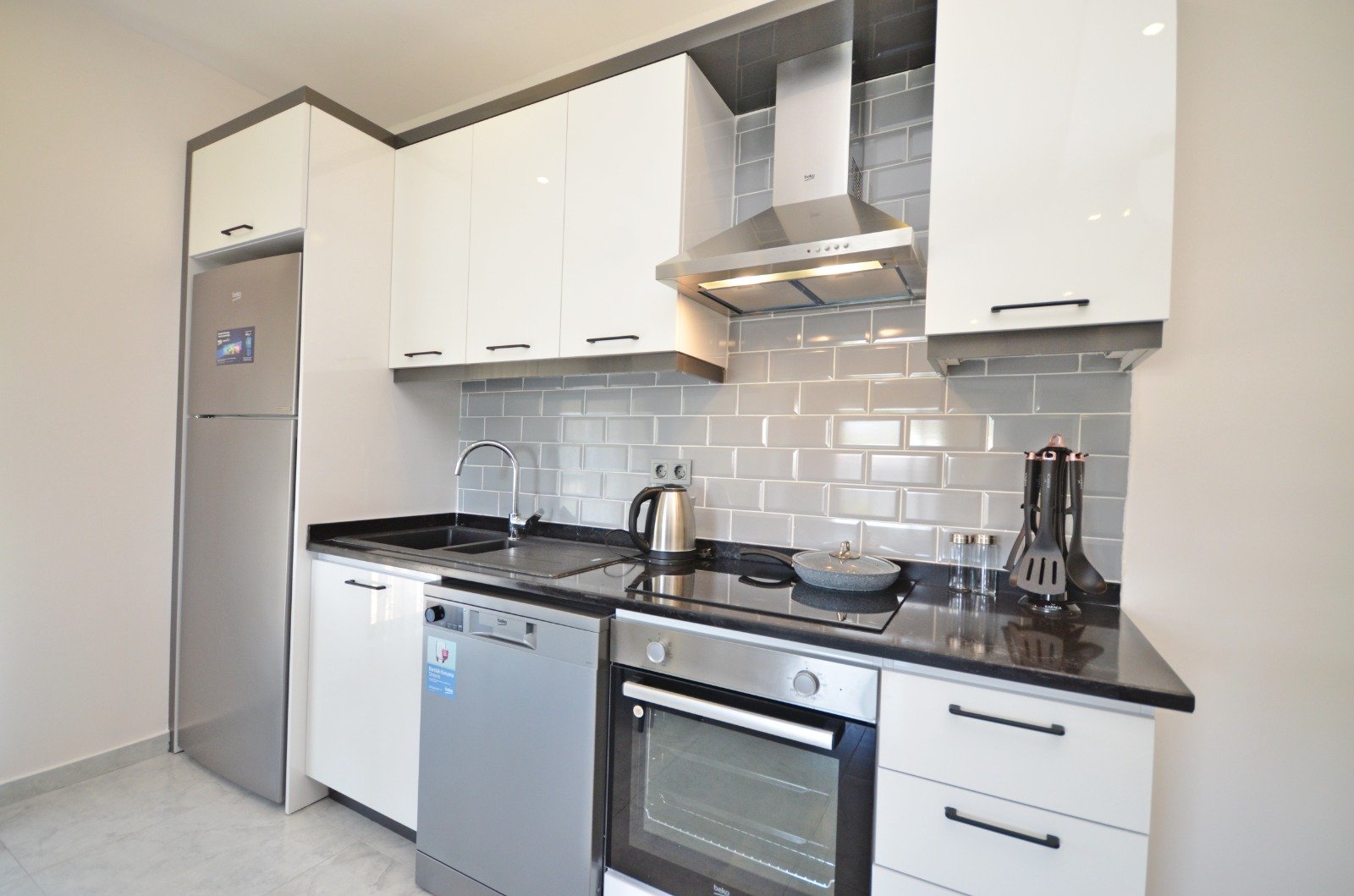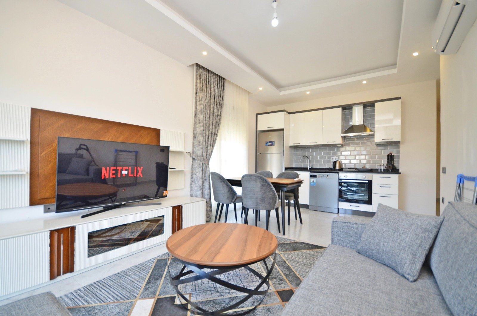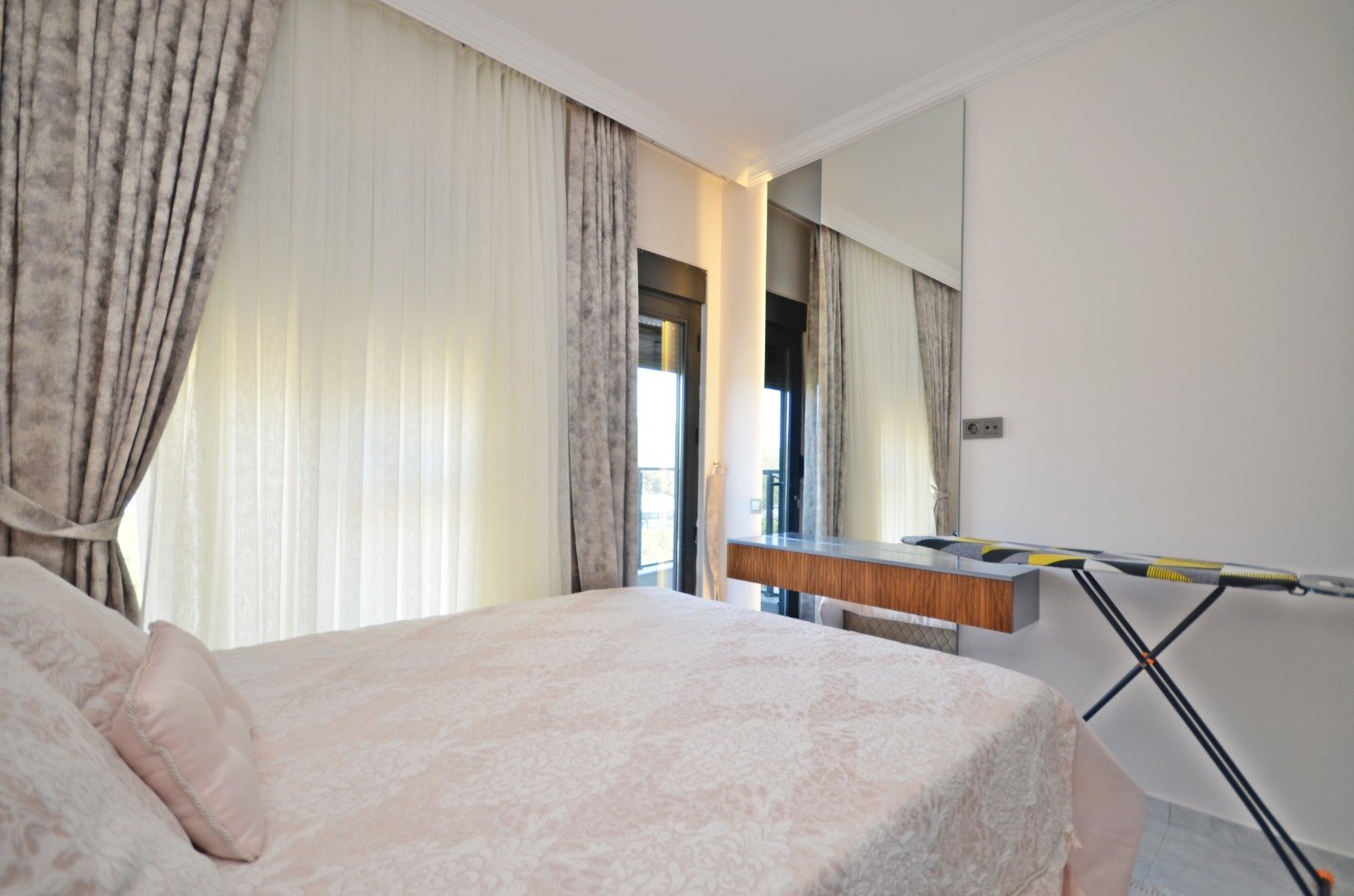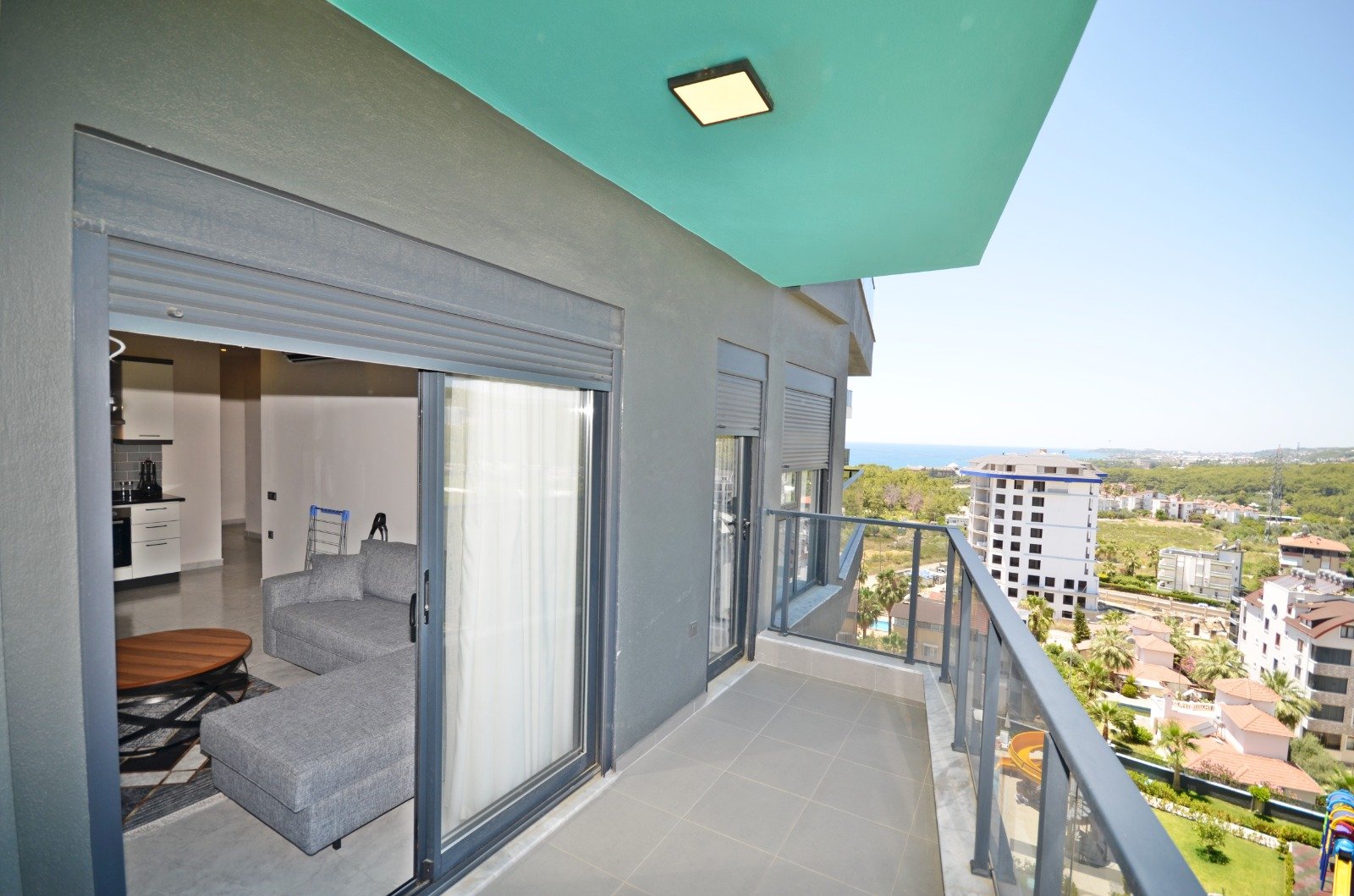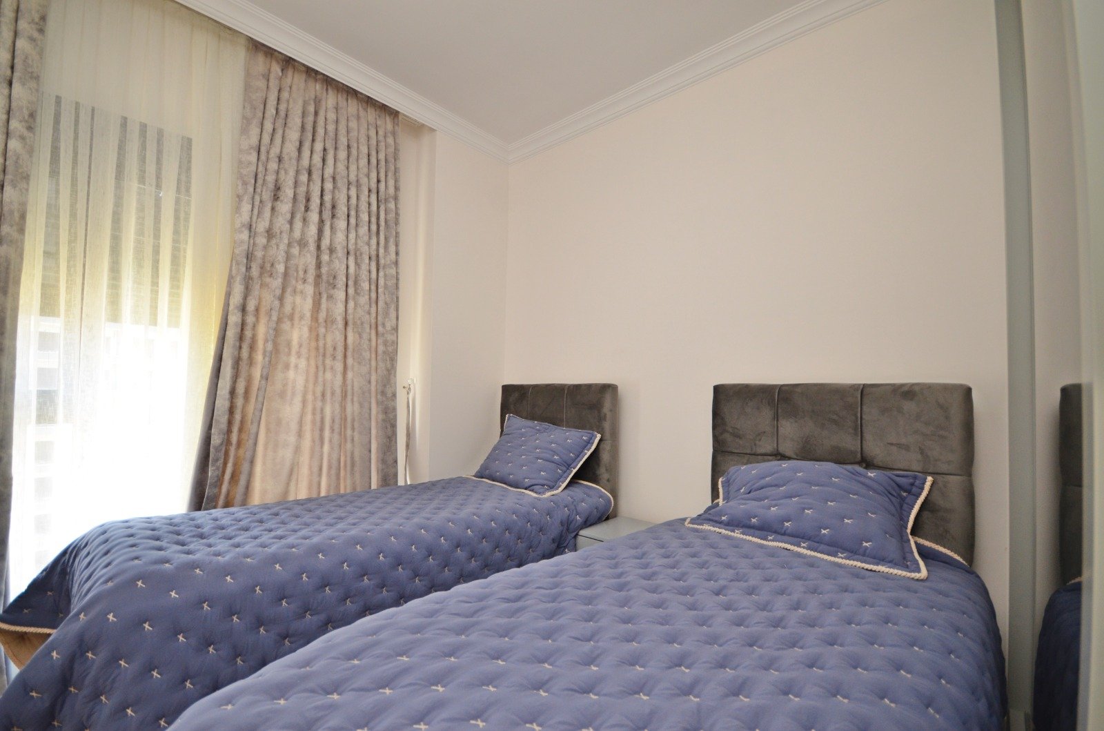Квартира планировки 2+1 площадью 85 м² расположена на 6 этаже и полностью меблирована. Пространство продумано для комфортного отдыха: светлая гостиная с кухонной зоной, две спальни, два санузла и балкон с приятными видами на море и территорию комплекса. В отделке использованы качественные материалы: керамические полы, аккуратные подвесные потолки с подсветкой, надёжные окна с двойным остеклением, бронированная входная дверь. Кухня оборудована встроенным гарнитуром с гранитной столешницей, ванные комнаты полностью укомплектованы сантехникой, мебелью и душевыми кабинами. Квартира выглядит ухоженной, стильной и полностью готовой к проживанию — без дополнительных вложений.