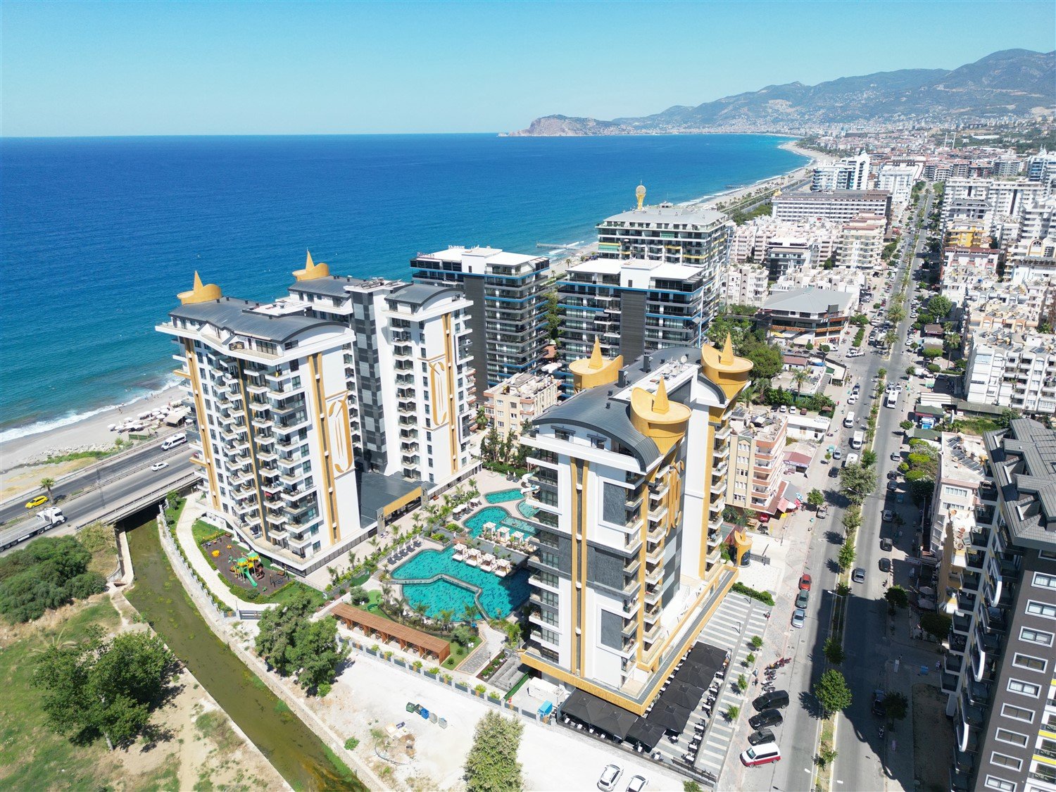 Махмутлар — самый динамичный и густонаселённый район Аланія, где постоянно проживает более 50 тысяч человек. Здесь сформирована полноценная городская инфраструктура: крупные супермаркеты, торговые центры, банки, рестораны, кофейни и фермерские базары. Всё находится рядом с домом — Migros, муниципалитет, почта, кафе и прогулочные улицы. Широкая набережная проходит вдоль моря и идеально подходит для прогулок, спорта и отдыха у воды. Комплекс расположен непосредственно у пляжа — достаточно пройти по безопасному подземному переходу, чтобы оказаться на собственной пляжной зоне.