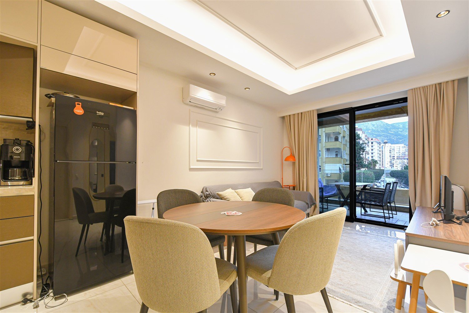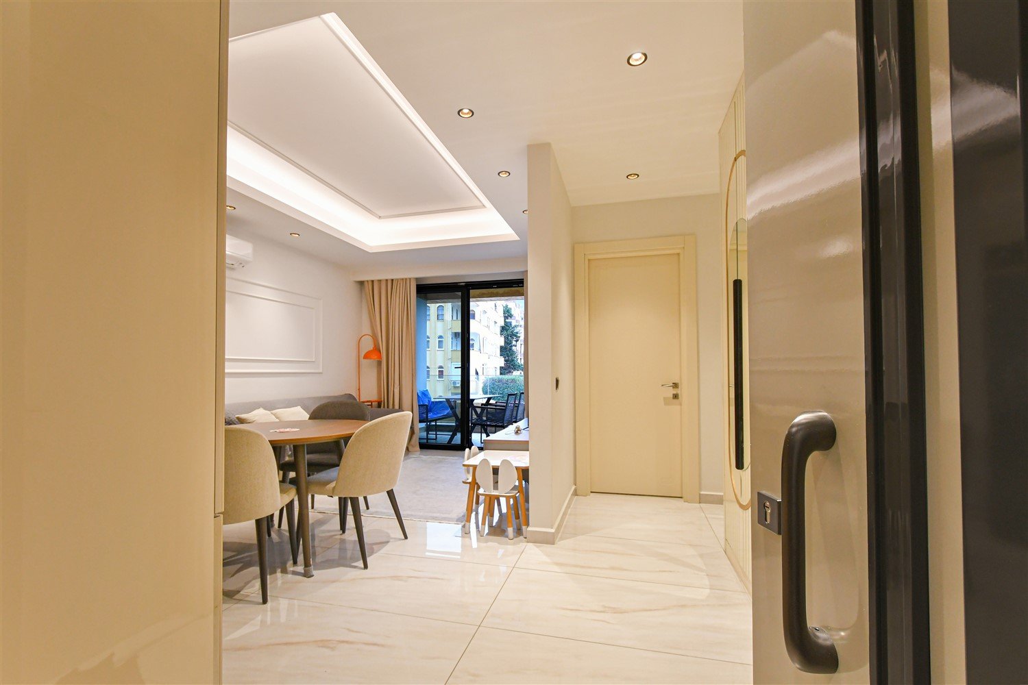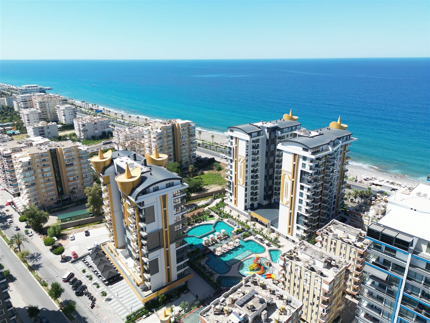 Просторная меблированная квартира планировки 2+1 в одном из самых престижных и масштабных комплексов района. Дом новый, построен в 2023 году, расположен прямо на первой береговой линии с собственным оборудованным пляжем и подземным переходом к морю. Это формат жизни, где всё необходимое находится буквально в нескольких шагах — от моря до городской инфраструктуры. Квартира находится на 1 этаже, что особенно удобно для семей с детьми и тех, кто ценит лёгкий доступ без ожидания лифта.